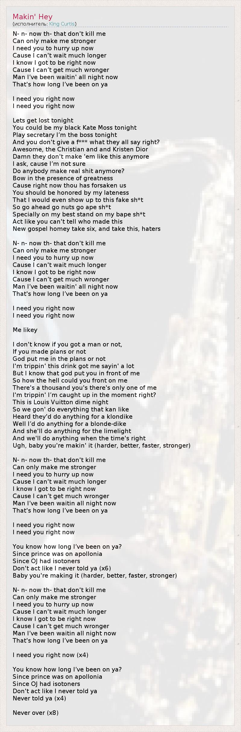 N- n- now th- that don't kill me Can only make me stronger I need you to hurry up now Cause I can't wait much longer I know I got to be right now Cause I can’t get much wronger Man I’ve been waitin' all night now That's how long I’ve been on ya I need you right now I need you right now Lets get lost tonight You could be my black Kate Moss tonight Play secretary I’m the boss tonight And you don't give a f*** what they all say right? Awesome, the Christian and and Kristen Dior Damn they don't make 'em like this anymore I ask, cause I’m not sure Do anybody make real shit anymore? Bow in the presence of greatness Cause right now thou has forsaken us You should be honored by my lateness That I would even show up to this fake sh*t So go ahead go nuts go ape sh*t Specially on my best stand on my bape sh*t Act like you can't tell who made this New gospel homey take six, and take this, haters N- n- now th- that don't kill me Can only make me stronger I need you to hurry up now Cause I can't wait much longer I know I got to be right now Cause I can’t get much wronger Man I’ve been waitin' all night now That's how long I’ve been on ya I need you right now I need you right now Me likey I don't know if you got a man or not, If you made plans or not God put me in the plans or not I'm trippin' this drink got me sayin' a lot But I know that god put you in front of me So how the hell could you front on me There's a thousand you's there's only one of me I'm trippin' I’m caught up in the moment right? This is Louis Vuitton dime night So we gon' do everything that kan like Heard they'd do anything for a klondike Well I’d do anything for a blonde-dike And she'll do anything for the limelight And we'll do anything when the time's right Ugh, baby you're makin' it (harder, better, faster, stronger) N- n- now th- that don't kill me Can only make me stronger I need you to hurry up now Cause I can't wait much longer I know I got to be right now Cause I can’t get much wronger Man I’ve been waitin all night now That's how long I’ve been on ya I need you right now I need you right now You know how long I’ve been on ya? Since prince was on apollonia Since OJ had isotoners Don't act like I never told ya (x6) Baby you're making it (harder, better, faster, stronger) N- n- now th- that don't kill me Can only make me stronger I need you to hurry up now Cause I can't wait much longer I know I got to be right now Cause I can’t get much wronger Man I’ve been waitin all night now That's how long I’ve been on ya I need you right now (x4) You know how long I’ve been on ya? Since prince was on apollonia Since OJ had isotoners Don't act like I never told ya Never told ya (x4) Never over (x8)