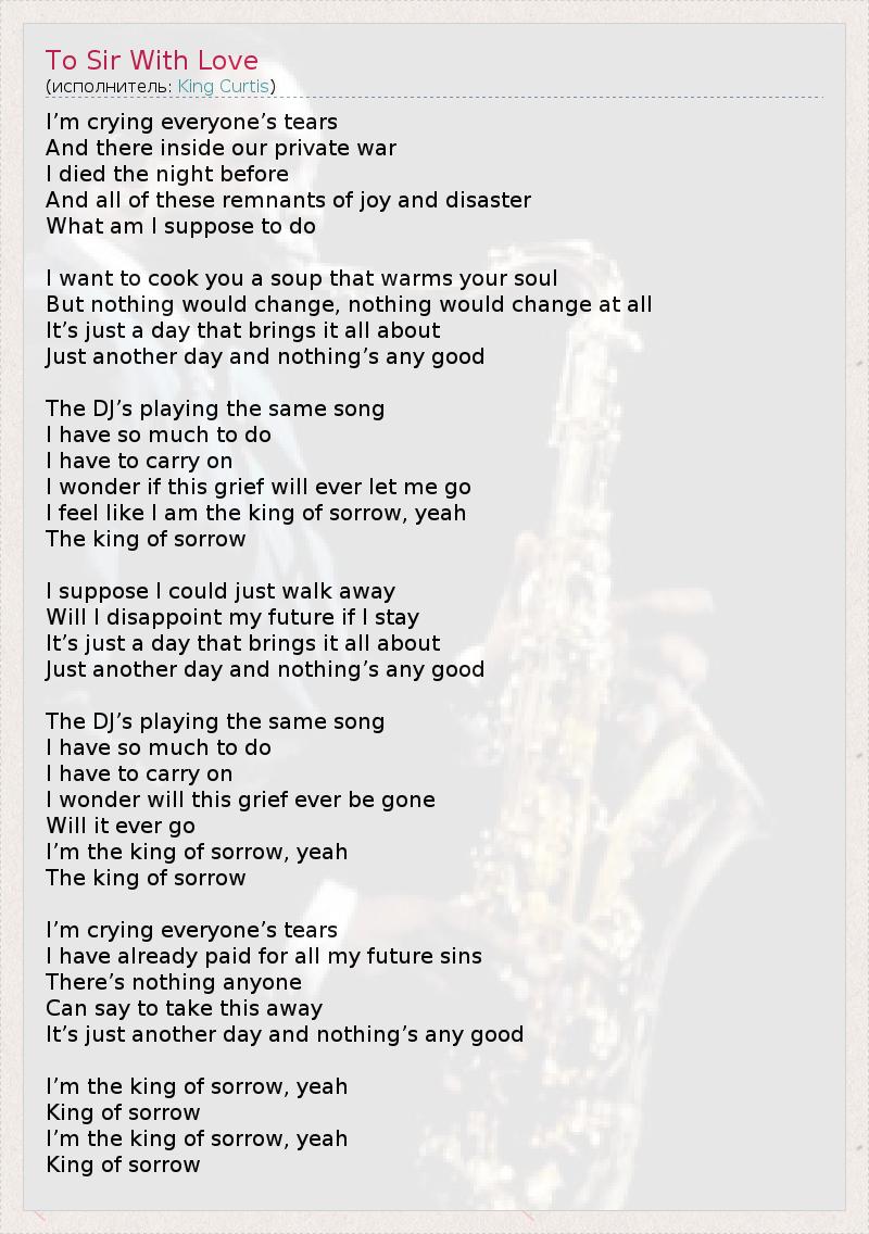 I’m crying everyone’s tears And there inside our private war I died the night before And all of these remnants of joy and disaster What am I suppose to do I want to cook you a soup that warms your soul But nothing would change, nothing would change at all It’s just a day that brings it all about Just another day and nothing’s any good The DJ’s playing the same song I have so much to do I have to carry on I wonder if this grief will ever let me go I feel like I am the king of sorrow, yeah The king of sorrow I suppose I could just walk away Will I disappoint my future if I stay It’s just a day that brings it all about Just another day and nothing’s any good The DJ’s playing the same song I have so much to do I have to carry on I wonder will this grief ever be gone Will it ever go I’m the king of sorrow, yeah The king of sorrow I’m crying everyone’s tears I have already paid for all my future sins There’s nothing anyone Can say to take this away It’s just another day and nothing’s any good I’m the king of sorrow, yeah King of sorrow I’m the king of sorrow, yeah King of sorrow