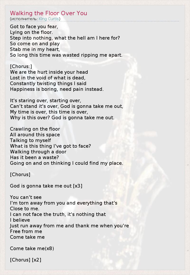 Got to face you fear, Lying on the floor. Step into nothing, what the hell am I here for? So come on and play Stab me in my heart, So long this time was wasted ripping me apart. [Chorus:] We are the hurt inside your head Lost in the void of what is dead, Constantly twisting things I said Happiness is boring, need pain instead. It's staring over, starting over, Can't stand it's over, God is gonna take me out, My time is over, this time is over, Why is this over? God is gonna take me out. Crawling on the floor All around this space Talking to myself What is this thing I've got to face? Walking through a door Has it been a waste? Going on and on thinking I could find my place. [Chorus] God is gonna take me out [x3] You can't see I'm torn away from you and everything that's Close to me. I can not face the truth, it's nothing that I believe Just run away from me and thank me when you're Free from me Come take me Come take me(x8) [Chorus] [x2]