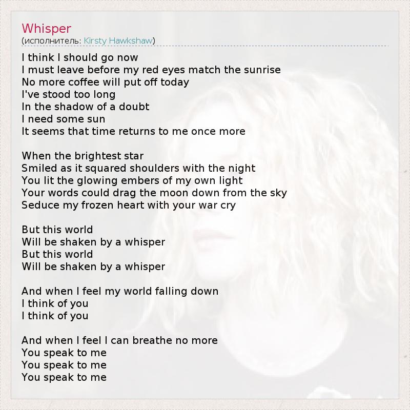 Думаю, я должна сейчас уйти, Я должна уйти прежде, чем мои красные глаза станут одного цвета с восходом. Больше никакого кофе, не буду откладывать сегодняшний день, Я стояла на месте слишком долго. В тени сомнений – Мне нужно немного солнца. Кажется, что это время снова ко мне вернулось... Когда ярчайшая звезда Улыбнулась, отодвинув ночь, Ты разжёг тлеющие угольки моего собственного света. Твои слова могут стащить луну с неба, Обольстить моё замерзшее сердце с воинственным кличем, Но этот мир Покачнётся от шёпота, Но этот мир Покачнется от шёпота. И когда я чувствую, что мой мир падает, Я думаю о тебе, Я думаю о тебе. И когда я чувствую, что не могу больше дышать, Ты говоришь со мной, Ты говоришь со мной, Ты говоришь со мной.