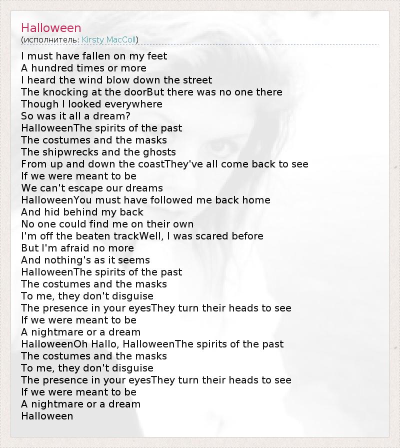 I must have fallen on my feet A hundred times or more I heard the wind blow down the street The knocking at the doorBut there was no one there Though I looked everywhere So was it all a dream? HalloweenThe spirits of the past The costumes and the masks The shipwrecks and the ghosts From up and down the coastThey've all come back to see If we were meant to be We can't escape our dreams HalloweenYou must have followed me back home And hid behind my back No one could find me on their own I'm off the beaten trackWell, I was scared before But I'm afraid no more And nothing's as it seems HalloweenThe spirits of the past The costumes and the masks To me, they don't disguise The presence in your eyesThey turn their heads to see If we were meant to be A nightmare or a dream HalloweenOh Hallo, HalloweenThe spirits of the past The costumes and the masks To me, they don't disguise The presence in your eyesThey turn their heads to see If we were meant to be A nightmare or a dream Halloween