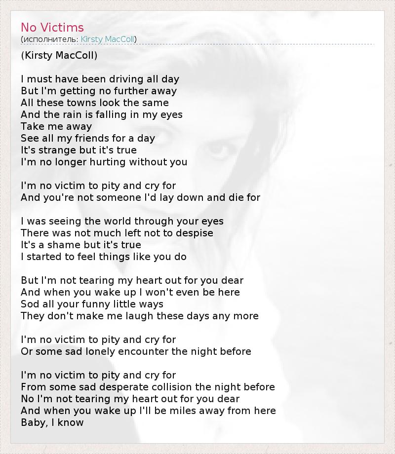 (Kirsty MacColl) I must have been driving all day But I'm getting no further away All these towns look the same And the rain is falling in my eyes Take me away See all my friends for a day It's strange but it's true I'm no longer hurting without you I'm no victim to pity and cry for And you're not someone I'd lay down and die for I was seeing the world through your eyes There was not much left not to despise It's a shame but it's true I started to feel things like you do But I'm not tearing my heart out for you dear And when you wake up I won't even be here Sod all your funny little ways They don't make me laugh these days any more I'm no victim to pity and cry for Or some sad lonely encounter the night before I'm no victim to pity and cry for From some sad desperate collision the night before No I'm not tearing my heart out for you dear And when you wake up I'll be miles away from here Baby, I know