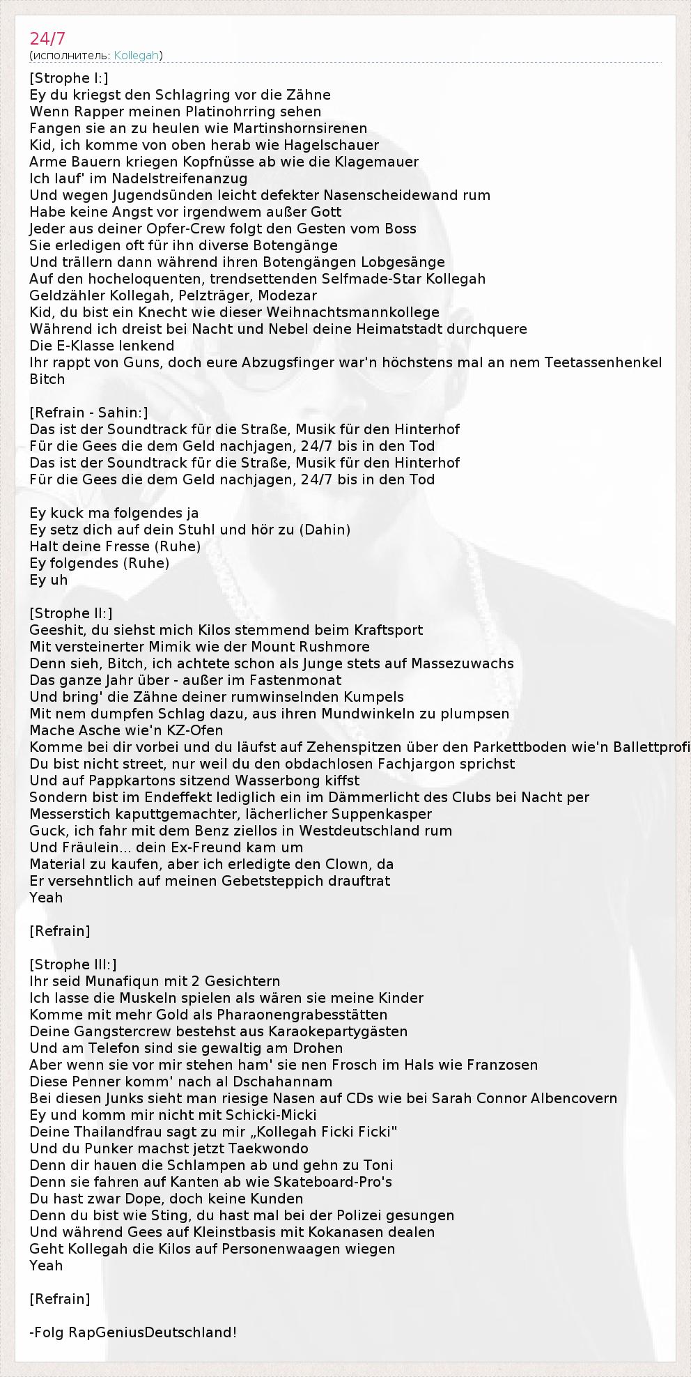 Это интересно:Kollegah (* 3. August 1984 in Friedberg (Hessen) bürgerlich Felix Antoine Blume) ist ein deutscher Rapper, der beim Label Selfmade Records unter Vertrag steht. Er ist auch bekannt unter dem Pseudonym T.O.N.I..Blume ist der Sohn eines kanadischen Vaters und einer deutschen Mutter und verbrachte seine Jugend teilweise vaterlos. Der Spitzname „Kollegah“ ist auf seinen Stiefvater zurückzuführen. Kollegah wuchs in der Stadt Simmern im Hunsrück auf.Kollegah konvertierte mit 15 Jahren zum Islam. In einem Interview erklärte er, dass er sich durch seinen algerischen Stiefvater mit der Religion in Kontakt kam. Er fing an sich zu informieren und Bücher über den Islam zu lesen. Daraufhin konvertierte... продолжение