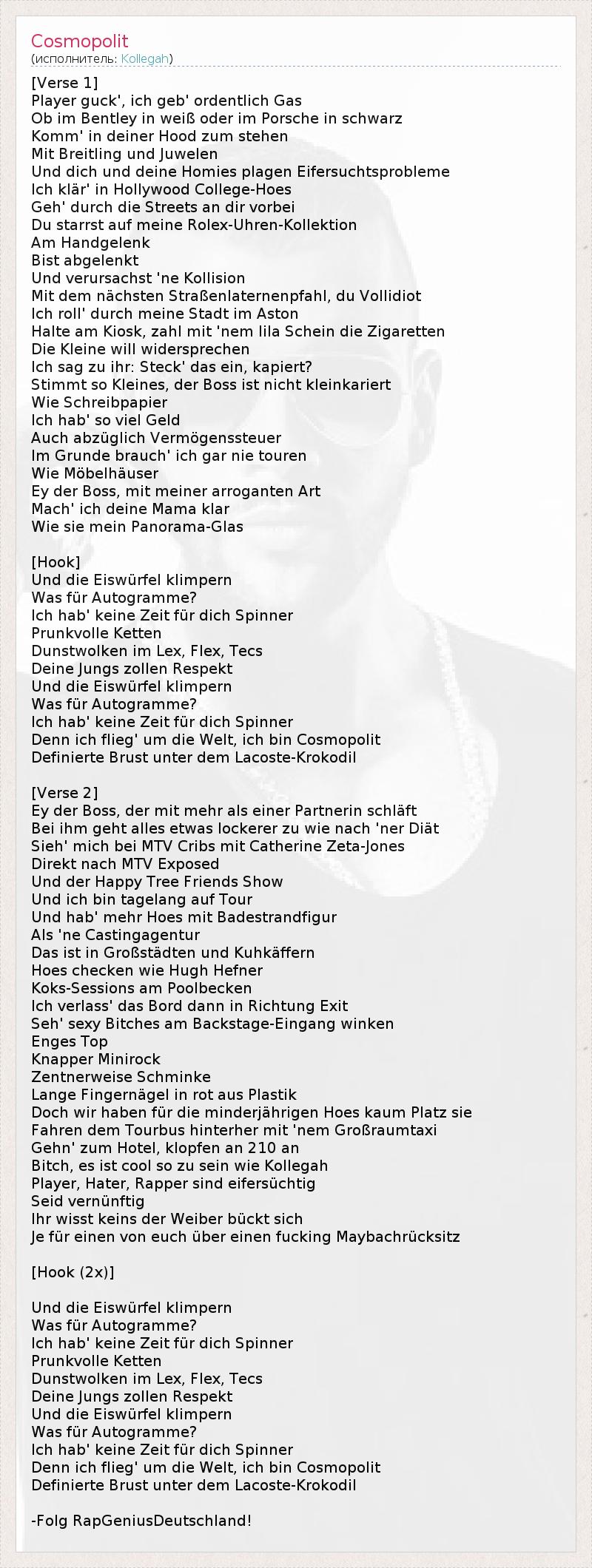[Verse 1] Player guck', ich geb' ordentlich Gas Ob im Bentley in weiß oder im Porsche in schwarz Komm' in deiner Hood zum stehen Mit Breitling und Juwelen Und dich und deine Homies plagen Eifersuchtsprobleme Ich klär' in Hollywood College-Hoes Geh' durch die Streets an dir vorbei Du starrst auf meine Rolex-Uhren-Kollektion Am Handgelenk Bist abgelenkt Und verursachst 'ne Kollision Mit dem nächsten Straßenlaternenpfahl, du Vollidiot Ich roll' durch meine Stadt im Aston Halte am Kiosk, zahl mit 'nem lila Schein die Zigaretten Die Kleine will widersprechen Ich sag zu ihr: Steck' das ein, kapiert? Stimmt so Kleines, der Boss ist nicht kleinkariert Wie Schreibpapier Ich hab' so viel Geld Auch abzüglich Vermögenssteuer Im Grunde brauch' ich gar nie touren Wie Möbelhäuser Ey der Boss, mit meiner arroganten Art Mach' ich deine Mama klar Wie sie mein Panorama-Glas [Hook] Und die Eiswürfel klimpern Was für Autogramme? Ich hab' keine Zeit für dich Spinner Prunkvolle Ketten Dunstwolken im Lex, Flex, Tecs Deine Jungs zollen Respekt Und die Eiswürfel klimpern Was für Autogramme? Ich hab' keine Zeit für dich Spinner Denn ich flieg' um die Welt, ich bin Cosmopolit Definierte Brust unter dem Lacoste-Krokodil [Verse 2] Ey der Boss, der mit mehr als einer Partnerin schläft Bei ihm geht alles etwas lockerer zu wie nach 'ner Diät Sieh' mich bei MTV Cribs mit Catherine Zeta-Jones Direkt nach MTV Exposed Und der Happy Tree Friends Show Und ich bin tagelang auf Tour Und hab' mehr Hoes mit Badestrandfigur Als 'ne Castingagentur Das ist in Großstädten und Kuhkäffern Hoes checken wie Hugh Hefner Koks-Sessions am Poolbecken Ich verlass' das Bord dann in Richtung Exit Seh' sexy Bitches am Backstage-Eingang winken Enges Top Knapper Minirock Zentnerweise Schminke Lange Fingernägel in rot aus Plastik Doch wir haben für die minderjährigen Hoes kaum Platz sie Fahren dem Tourbus hinterher mit 'nem Großraumtaxi Gehn' zum Hotel, klopfen an 210 an Bitch, es ist cool so zu sein wie Kollegah Player, Hater, Rapper sind eifersüchtig Seid vernünftig Ihr wisst keins der Weiber bückt sich Je für einen von euch über einen fucking Maybachrücksitz [Hook (2x)] Und die Eiswürfel klimpern Was für Autogramme? Ich hab' keine Zeit für dich Spinner Prunkvolle Ketten Dunstwolken im Lex, Flex, Tecs Deine Jungs zollen Respekt Und die Eiswürfel klimpern Was für Autogramme? Ich hab' keine Zeit für dich Spinner Denn ich flieg' um die Welt, ich bin Cosmopolit Definierte Brust unter dem Lacoste-Krokodil -Folg RapGeniusDeutschland!