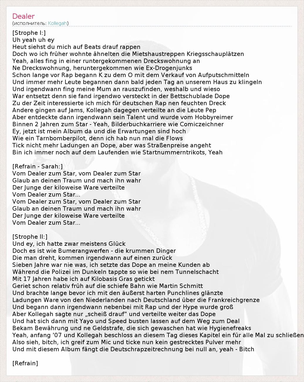 [Strophe I:] Uh yeah uh ey Heut siehst du mich auf Beats drauf rappen Doch wo ich früher wohnte ähnelten die Mietshaustreppen Kriegsschauplätzen Yeah, alles fing in einer runtergekommenen Dreckswohnung an Ne Dreckswohnung, heruntergekommen wie Ex-Drogenjunks Schon lange vor Rap begann K zu dem O mit dem Verkauf von Aufputschmitteln Und immer mehr Leute begannen dann bald jeden Tag an unserem Haus zu klingeln Und irgendwann fing meine Mum an rauszufinden, weshalb und wieso War entsetzt denn sie fand irgendwo versteckt in der Bettschublade Dope Zu der Zeit interessierte ich mich für deutschen Rap nen feuchten Dreck Andere gingen auf Jams, Kollegah dagegen verteilte an die Leute Pep Aber entdeckte dann irgendwann sein Talent und wurde vom Hobbyreimer Binnen 2 Jahren zum Star - Yeah, Bilderbuchkarriere wie Comiczeichner Ey, jetzt ist mein Album da und die Erwartungen sind hoch Wie ein Tarnbomberpilot, denn ich hab nun mal die Flows Tick nicht mehr Ladungen an Dope, aber was Straßenpreise angeht Bin ich immer noch auf dem Laufenden wie Startnummerntrikots, Yeah [Refrain - Sarah:] Vom Dealer zum Star, vom Dealer zum Star Glaub an deinen Traum und mach ihn wahr Der Junge der kiloweise Ware verteilte Vom Dealer zum Star... Vom Dealer zum Star, vom Dealer zum Star Glaub an deinen Traum und mach ihn wahr Der Junge der kiloweise Ware verteilte Vom Dealer zum Star... [Strophe II:] Und ey, ich hatte zwar meistens Glück Doch es ist wie Bumerangwerfen - die krummen Dinger Die man dreht, kommen irgendwann auf einen zurück Sieben Jahre war nie was, ich setzte das Dope an meine Kunden ab Während die Polizei im Dunkeln tappte so wie bei nem Tunnelschacht Mit 17 Jahren habe ich auf Kilobasis Gras getickt Geriet schon relativ früh auf die schiefe Bahn wie Martin Schmitt Und brachte lange bevor ich mit den äußerst harten Punchlines glänzte Ladungen Ware von den Niederlanden nach Deutschland über die Frankreichgrenze Und begann dann irgendwann nebenbei mit Rap und der Hype wurde groß Aber Kollegah sagte nur „scheiß drauf" und verteilte weiter das Dope Und hat sich dann mit Yayo und Speed busten lassen auf dem Weg zum Deal Bekam Bewährung und ne Geldstrafe, die sich gewaschen hat wie Hygienefreaks Yeah, anfang '07 und Kollegah beschloss an diesem Tag dieses Kapitel ein für alle Mal zu schließen Also sieh, bitch, ich greif zum Mic und ticke nun kein gestrecktes Pulver mehr Und mit diesem Album fängt die Deutschrapzeitrechnung bei null an, yeah - Bitch [Refrain]