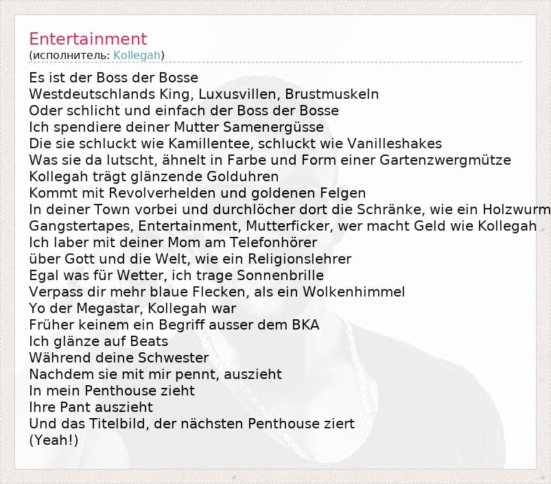 Es ist der Boss der Bosse Westdeutschlands King, Luxusvillen, Brustmuskeln Oder schlicht und einfach der Boss der Bosse Ich spendiere deiner Mutter Samenergüsse Die sie schluckt wie Kamillentee, schluckt wie Vanilleshakes Was sie da lutscht, ähnelt in Farbe und Form einer Gartenzwergmütze Kollegah trägt glänzende Golduhren Kommt mit Revolverhelden und goldenen Felgen In deiner Town vorbei und durchlöcher dort die Schränke, wie ein Holzwurm Gangstertapes, Entertainment, Mutterficker, wer macht Geld wie Kollegah Ich laber mit deiner Mom am Telefonhörer über Gott und die Welt, wie ein Religionslehrer Egal was für Wetter, ich trage Sonnenbrille Verpass dir mehr blaue Flecken, als ein Wolkenhimmel Yo der Megastar, Kollegah war Früher keinem ein Begriff ausser dem BKA Ich glänze auf Beats Während deine Schwester Nachdem sie mit mir pennt, auszieht In mein Penthouse zieht Ihre Pant auszieht Und das Titelbild, der nächsten Penthouse ziert (Yeah!)