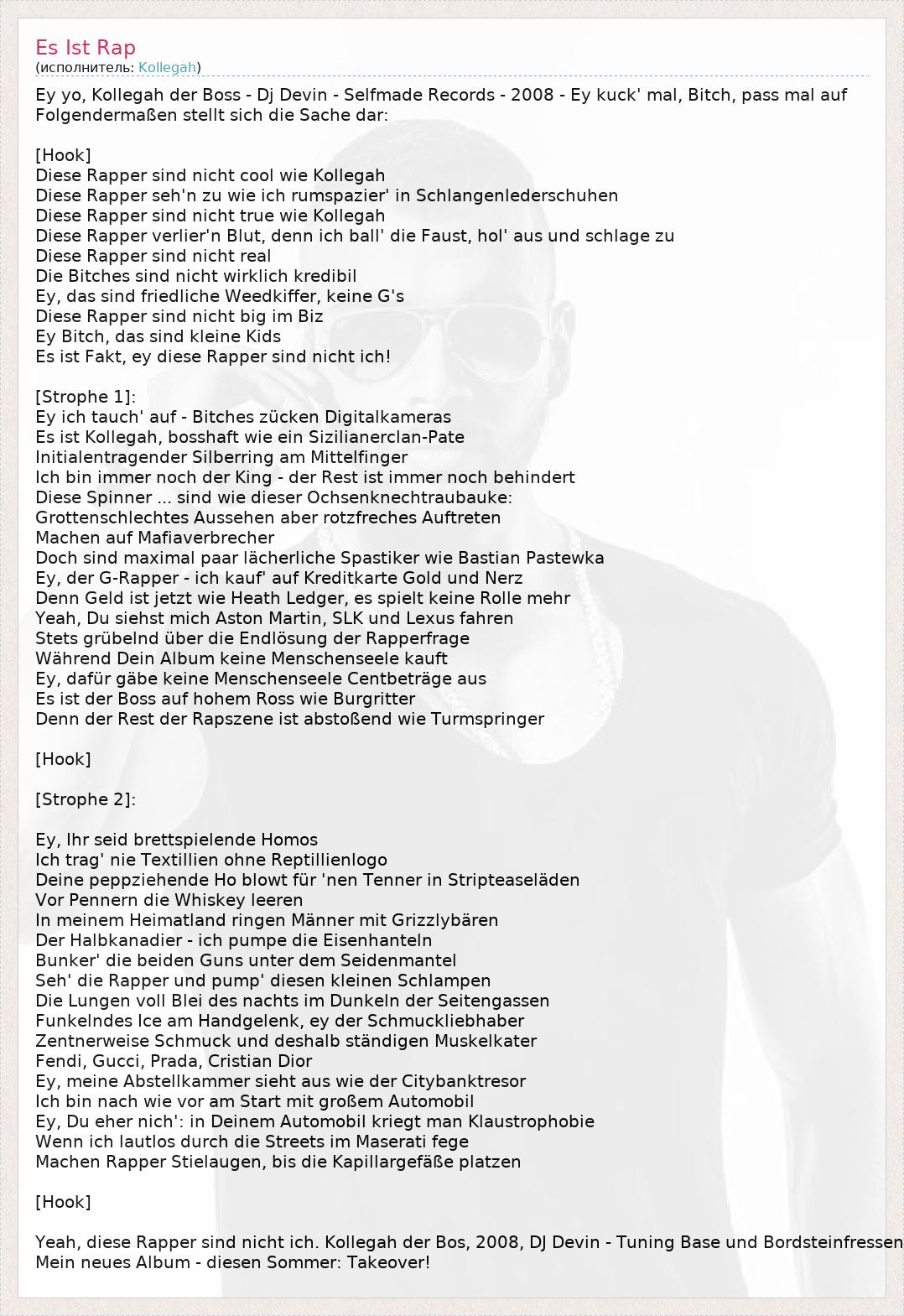 Ey yo, Kollegah der Boss - Dj Devin - Selfmade Records - 2008 - Ey kuck' mal, Bitch, pass mal auf Folgendermaßen stellt sich die Sache dar: [Hook] Diese Rapper sind nicht cool wie Kollegah Diese Rapper seh'n zu wie ich rumspazier' in Schlangenlederschuhen Diese Rapper sind nicht true wie Kollegah Diese Rapper verlier'n Blut, denn ich ball' die Faust, hol' aus und schlage zu Diese Rapper sind nicht real Die Bitches sind nicht wirklich kredibil Ey, das sind friedliche Weedkiffer, keine G's Diese Rapper sind nicht big im Biz Ey Bitch, das sind kleine Kids Es ist Fakt, ey diese Rapper sind nicht ich! [Strophe 1]: Ey ich tauch' auf - Bitches zücken Digitalkameras Es ist Kollegah, bosshaft wie ein Sizilianerclan-Pate Initialentragender Silberring am Mittelfinger Ich bin immer noch der King - der Rest ist immer noch behindert Diese Spinner ... sind wie dieser Ochsenknechtraubauke: Grottenschlechtes Aussehen aber rotzfreches Auftreten Machen auf Mafiaverbrecher Doch sind maximal paar lächerliche Spastiker wie Bastian Pastewka Ey, der G-Rapper - ich kauf' auf Kreditkarte Gold und Nerz Denn Geld ist jetzt wie Heath Ledger, es spielt keine Rolle mehr Yeah, Du siehst mich Aston Martin, SLK und Lexus fahren Stets grübelnd über die Endlösung der Rapperfrage Während Dein Album keine Menschenseele kauft Ey, dafür gäbe keine Menschenseele Centbeträge aus Es ist der Boss auf hohem Ross wie Burgritter Denn der Rest der Rapszene ist abstoßend wie Turmspringer [Hook] [Strophe 2]: Ey, Ihr seid brettspielende Homos Ich trag' nie Textillien ohne Reptillienlogo Deine peppziehende Ho blowt für 'nen Tenner in Stripteaseläden Vor Pennern die Whiskey leeren In meinem Heimatland ringen Männer mit Grizzlybären Der Halbkanadier - ich pumpe die Eisenhanteln Bunker' die beiden Guns unter dem Seidenmantel Seh' die Rapper und pump' diesen kleinen Schlampen Die Lungen voll Blei des nachts im Dunkeln der Seitengassen Funkelndes Ice am Handgelenk, ey der Schmuckliebhaber Zentnerweise Schmuck und deshalb ständigen Muskelkater Fendi, Gucci, Prada, Cristian Dior Ey, meine Abstellkammer sieht aus wie der Citybanktresor Ich bin nach wie vor am Start mit großem Automobil Ey, Du eher nich': in Deinem Automobil kriegt man Klaustrophobie Wenn ich lautlos durch die Streets im Maserati fege Machen Rapper Stielaugen, bis die Kapillargefäße platzen [Hook] Yeah, diese Rapper sind nicht ich. Kollegah der Bos, 2008, DJ Devin - Tuning Base und Bordsteinfressen Mein neues Album - diesen Sommer: Takeover!