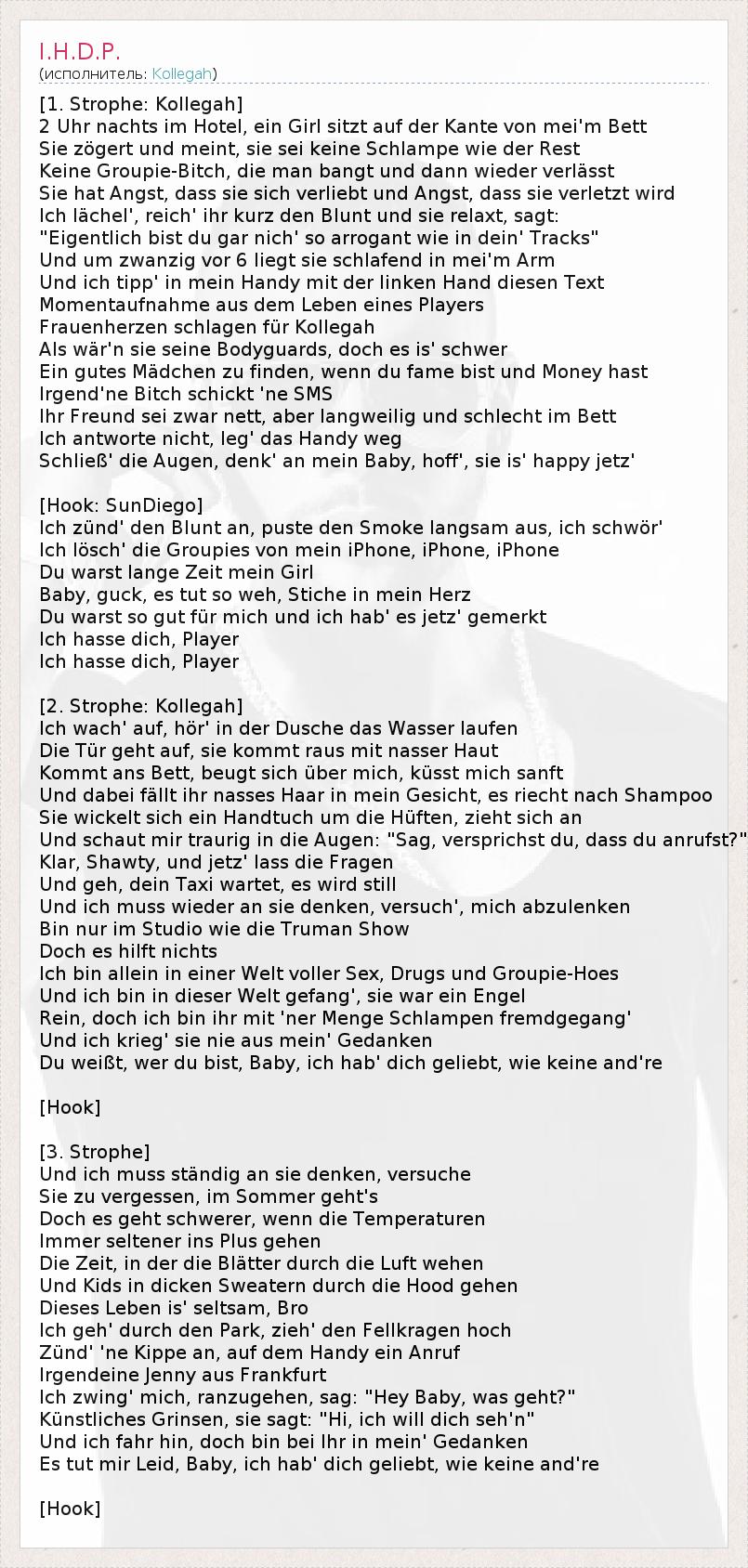 [1. Strophe: Kollegah] 2 Uhr nachts im Hotel, ein Girl sitzt auf der Kante von mei'm Bett Sie zögert und meint, sie sei keine Schlampe wie der Rest Keine Groupie-Bitch, die man bangt und dann wieder verlässt Sie hat Angst, dass sie sich verliebt und Angst, dass sie verletzt wird Ich lächel', reich' ihr kurz den Blunt und sie relaxt, sagt: "Eigentlich bist du gar nich' so arrogant wie in dein' Tracks" Und um zwanzig vor 6 liegt sie schlafend in mei'm Arm Und ich tipp' in mein Handy mit der linken Hand diesen Text Momentaufnahme aus dem Leben eines Players Frauenherzen schlagen für Kollegah Als wär'n sie seine Bodyguards, doch es is' schwer Ein gutes Mädchen zu finden, wenn du fame bist und Money hast Irgend'ne Bitch schickt 'ne SMS Ihr Freund sei zwar nett, aber langweilig und schlecht im Bett Ich antworte nicht, leg' das Handy weg Schließ' die Augen, denk' an mein Baby, hoff', sie is' happy jetz' [Hook: SunDiego] Ich zünd' den Blunt an, puste den Smoke langsam aus, ich schwör' Ich lösch' die Groupies von mein iPhone, iPhone, iPhone Du warst lange Zeit mein Girl Baby, guck, es tut so weh, Stiche in mein Herz Du warst so gut für mich und ich hab' es jetz' gemerkt Ich hasse dich, Player Ich hasse dich, Player [2. Strophe: Kollegah] Ich wach' auf, hör' in der Dusche das Wasser laufen Die Tür geht auf, sie kommt raus mit nasser Haut Kommt ans Bett, beugt sich über mich, küsst mich sanft Und dabei fällt ihr nasses Haar in mein Gesicht, es riecht nach Shampoo Sie wickelt sich ein Handtuch um die Hüften, zieht sich an Und schaut mir traurig in die Augen: "Sag, versprichst du, dass du anrufst?" Klar, Shawty, und jetz' lass die Fragen Und geh, dein Taxi wartet, es wird still Und ich muss wieder an sie denken, versuch', mich abzulenken Bin nur im Studio wie die Truman Show Doch es hilft nichts Ich bin allein in einer Welt voller Sex, Drugs und Groupie-Hoes Und ich bin in dieser Welt gefang', sie war ein Engel Rein, doch ich bin ihr mit 'ner Menge Schlampen fremdgegang' Und ich krieg' sie nie aus mein' Gedanken Du weißt, wer du bist, Baby, ich hab' dich geliebt, wie keine and're [Hook] [3. Strophe] Und ich muss ständig an sie denken, versuche Sie zu vergessen, im Sommer geht's Doch es geht schwerer, wenn die Temperaturen Immer seltener ins Plus gehen Die Zeit, in der die Blätter durch die Luft wehen Und Kids in dicken Sweatern durch die Hood gehen Dieses Leben is' seltsam, Bro Ich geh' durch den Park, zieh' den Fellkragen hoch Zünd' 'ne Kippe an, auf dem Handy ein Anruf Irgendeine Jenny aus Frankfurt Ich zwing' mich, ranzugehen, sag: "Hey Baby, was geht?" Künstliches Grinsen, sie sagt: "Hi, ich will dich seh'n" Und ich fahr hin, doch bin bei Ihr in mein' Gedanken Es tut mir Leid, Baby, ich hab' dich geliebt, wie keine and're [Hook]