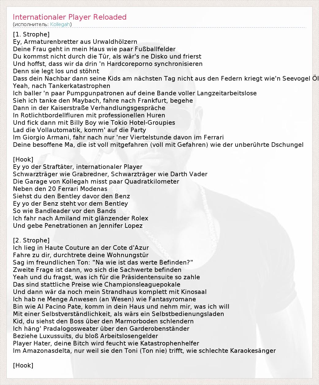 [1. Strophe] Ey, Armaturenbretter aus Urwaldhölzern Deine Frau geht in mein Haus wie paar Fußballfelder Du kommst nicht durch die Tür, als wär's ne Disko und frierst Und hoffst, dass wir da drin 'n Hardcoreporno synchronisieren Denn sie legt los und stöhnt Dass dein Nachbar dann seine Kids am nächsten Tag nicht aus den Federn kriegt wie'n Seevogel Öl Yeah, nach Tankerkatastrophen Ich baller 'n paar Pumpgunpatronen auf deine Bande voller Langzeitarbeitslose Sieh ich tanke den Maybach, fahre nach Frankfurt, begehe Dann in der Kaiserstraße Verhandlungsgespräche In Rotlichtbordellfluren mit professionellen Huren Und fick dann mit Billy Boy wie Tokio Hotel-Groupies Lad die Vollautomatik, komm' auf die Party Im Giorgio Armani, fahr nach nur 'ner Viertelstunde davon im Ferrari Deine besoffene Ma, die ist voll mitgefahren (voll mit Gefahren) wie der unberührte Dschungel [Hook] Ey yo der Straftäter, internationaler Player Schwarzträger wie Grabredner, Schwarzträger wie Darth Vader Die Garage von Kollegah misst paar Quadratkilometer Neben den 20 Ferrari Modenas Siehst du den Bentley davor den Benz Ey yo der Benz steht vor dem Bentley So wie Bandleader vor den Bands Ich fahr nach Amiland mit glänzender Rolex Und gebe Penetrationen an Jennifer Lopez [2. Strophe] Ich lieg in Haute Couture an der Cote d'Azur Fahre zu dir, durchtrete deine Wohnungstür Sag im freundlichen Ton: "Na wie ist das werte Befinden?" Zweite Frage ist dann, wo sich die Sachwerte befinden Yeah und du fragst, was ich für die Präsidentensuite so zahle Das sind stattliche Preise wie Championsleaguepokale Und dann wär da noch mein Strandhaus komplett mit Kinosaal Ich hab ne Menge Anwesen (an Wesen) wie Fantasyromane Bin wie Al Pacino Pate, komm in dein Haus und nehm mir, was ich will Mit einer Selbstverständlichkeit, als wärs ein Selbstbedienungsladen Kid, du siehst den Boss über den Marmorboden schlendern Ich häng' Pradalogosweater über den Garderobenständer Beziehe Luxussuits, du bloß Arbeitslosengelder Player Hater, deine Bitch wird feucht wie Katastrophenhelfer Im Amazonasdelta, nur weil sie den Toni (Ton nie) trifft, wie schlechte Karaokesänger [Hook]