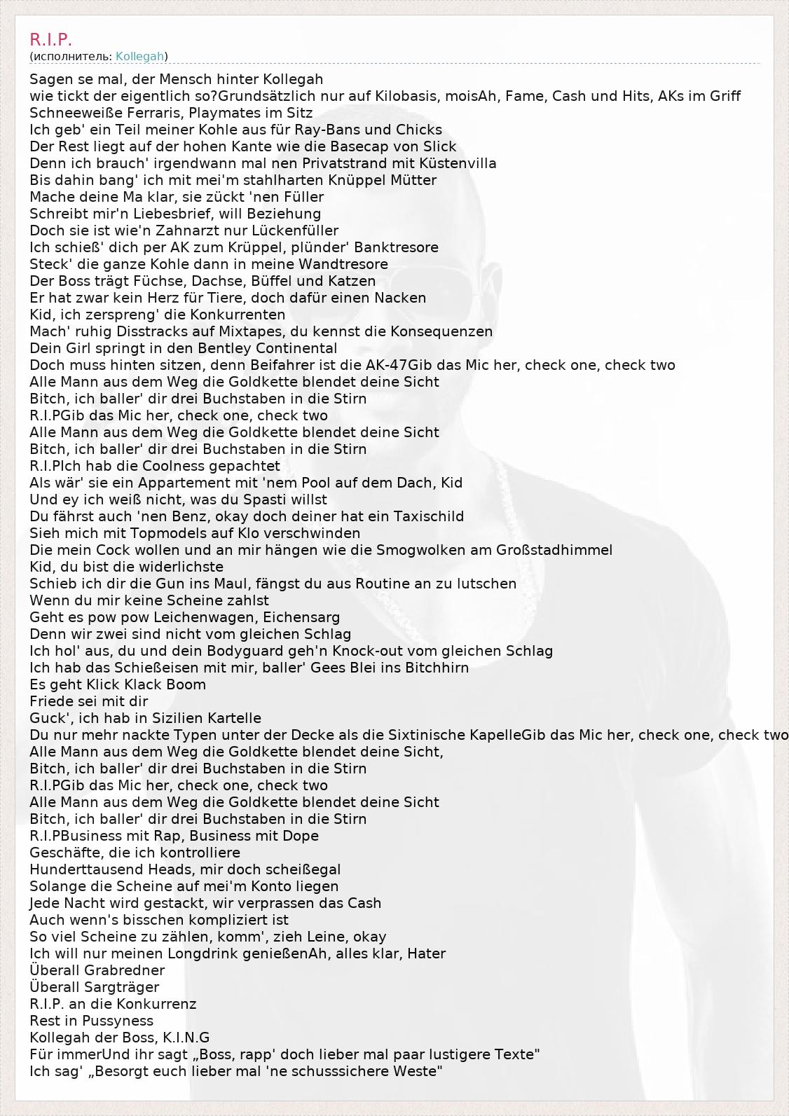 Sagen se mal, der Mensch hinter Kollegah wie tickt der eigentlich so?Grundsätzlich nur auf Kilobasis, moisAh, Fame, Cash und Hits, AKs im Griff Schneeweiße Ferraris, Playmates im Sitz Ich geb' ein Teil meiner Kohle aus für Ray-Bans und Chicks Der Rest liegt auf der hohen Kante wie die Basecap von Slick Denn ich brauch' irgendwann mal nen Privatstrand mit Küstenvilla Bis dahin bang' ich mit mei'm stahlharten Knüppel Mütter Mache deine Ma klar, sie zückt 'nen Füller Schreibt mir'n Liebesbrief, will Beziehung Doch sie ist wie'n Zahnarzt nur Lückenfüller Ich schieß' dich per AK zum Krüppel, plünder' Banktresore Steck' die ganze Kohle dann in meine Wandtresore Der Boss trägt Füchse, Dachse, Büffel und Katzen Er hat zwar kein Herz für Tiere, doch dafür einen Nacken Kid, ich zerspreng' die Konkurrenten Mach' ruhig Disstracks auf Mixtapes, du kennst die Konsequenzen Dein Girl springt in den Bentley Continental Doch muss hinten sitzen, denn Beifahrer ist die AK-47Gib das Mic her, check one, check two Alle Mann aus dem Weg die Goldkette blendet deine Sicht Bitch, ich baller' dir drei Buchstaben in die Stirn R.I.PGib das Mic her, check one, check two Alle Mann aus dem Weg die Goldkette blendet deine Sicht Bitch, ich baller' dir drei Buchstaben in die Stirn R.I.PIch hab die Coolness gepachtet Als wär' sie ein Appartement mit 'nem Pool auf dem Dach, Kid Und ey ich weiß nicht, was du Spasti willst Du fährst auch 'nen Benz, okay doch deiner hat ein Taxischild Sieh mich mit Topmodels auf Klo verschwinden Die mein Cock wollen und an mir hängen wie die Smogwolken am Großstadhimmel Kid, du bist die widerlichste Schieb ich dir die Gun ins Maul, fängst du aus Routine an zu lutschen Wenn du mir keine Scheine zahlst Geht es pow pow Leichenwagen, Eichensarg Denn wir zwei sind nicht vom gleichen Schlag Ich hol' aus, du und dein Bodyguard geh'n Knock-out vom gleichen Schlag Ich hab das Schießeisen mit mir, baller' Gees Blei ins Bitchhirn Es geht Klick Klack Boom Friede sei mit dir Guck', ich hab in Sizilien Kartelle Du nur mehr nackte Typen unter der Decke als die Sixtinische KapelleGib das Mic her, check one, check two Alle Mann aus dem Weg die Goldkette blendet deine Sicht, Bitch, ich baller' dir drei Buchstaben in die Stirn R.I.PGib das Mic her, check one, check two Alle Mann aus dem Weg die Goldkette blendet deine Sicht Bitch, ich baller' dir drei Buchstaben in die Stirn R.I.PBusiness mit Rap, Business mit Dope Geschäfte, die ich kontrolliere Hunderttausend Heads, mir doch scheißegal Solange die Scheine auf mei'm Konto liegen Jede Nacht wird gestackt, wir verprassen das Cash Auch wenn's bisschen kompliziert ist So viel Scheine zu zählen, komm', zieh Leine, okay Ich will nur meinen Longdrink genießenAh, alles klar, Hater Überall Grabredner Überall Sargträger R.I.P. an die Konkurrenz Rest in Pussyness Kollegah der Boss, K.I.N.G Für immerUnd ihr sagt „Boss, rapp' doch lieber mal paar lustigere Texte" Ich sag' „Besorgt euch lieber mal 'ne schusssichere Weste"
