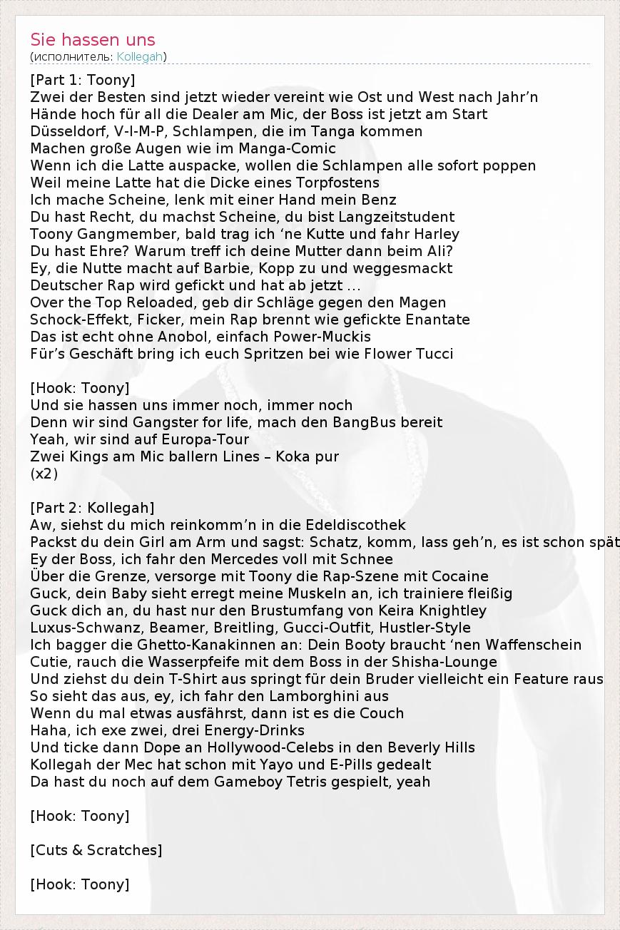 [Part 1: Toony] Zwei der Besten sind jetzt wieder vereint wie Ost und West nach Jahr’n Hände hoch für all die Dealer am Mic, der Boss ist jetzt am Start Düsseldorf, V-I-M-P, Schlampen, die im Tanga kommen Machen große Augen wie im Manga-Comic Wenn ich die Latte auspacke, wollen die Schlampen alle sofort poppen Weil meine Latte hat die Dicke eines Torpfostens Ich mache Scheine, lenk mit einer Hand mein Benz Du hast Recht, du machst Scheine, du bist Langzeitstudent Toony Gangmember, bald trag ich ‘ne Kutte und fahr Harley Du hast Ehre? Warum treff ich deine Mutter dann beim Ali? Ey, die Nutte macht auf Barbie, Kopp zu und weggesmackt Deutscher Rap wird gefickt und hat ab jetzt … Over the Top Reloaded, geb dir Schläge gegen den Magen Schock-Effekt, Ficker, mein Rap brennt wie gefickte Enantate Das ist echt ohne Anobol, einfach Power-Muckis Für’s Geschäft bring ich euch Spritzen bei wie Flower Tucci [Hook: Toony] Und sie hassen uns immer noch, immer noch Denn wir sind Gangster for life, mach den BangBus bereit Yeah, wir sind auf Europa-Tour Zwei Kings am Mic ballern Lines – Koka pur (x2) [Part 2: Kollegah] Aw, siehst du mich reinkomm’n in die Edeldiscothek Packst du dein Girl am Arm und sagst: Schatz, komm, lass geh’n, es ist schon spät Ey der Boss, ich fahr den Mercedes voll mit Schnee Über die Grenze, versorge mit Toony die Rap-Szene mit Cocaine Guck, dein Baby sieht erregt meine Muskeln an, ich trainiere fleißig Guck dich an, du hast nur den Brustumfang von Keira Knightley Luxus-Schwanz, Beamer, Breitling, Gucci-Outfit, Hustler-Style Ich bagger die Ghetto-Kanakinnen an: Dein Booty braucht ‘nen Waffenschein Cutie, rauch die Wasserpfeife mit dem Boss in der Shisha-Lounge Und ziehst du dein T-Shirt aus springt für dein Bruder vielleicht ein Feature raus So sieht das aus, ey, ich fahr den Lamborghini aus Wenn du mal etwas ausfährst, dann ist es die Couch Haha, ich exe zwei, drei Energy-Drinks Und ticke dann Dope an Hollywood-Celebs in den Beverly Hills Kollegah der Mec hat schon mit Yayo und E-Pills gedealt Da hast du noch auf dem Gameboy Tetris gespielt, yeah [Hook: Toony] [Cuts & Scratches] [Hook: Toony]