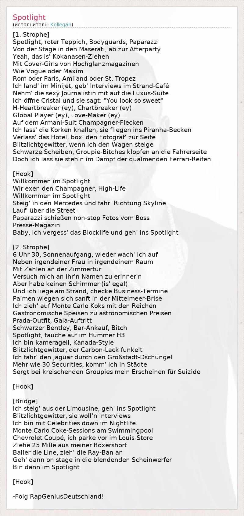 [1. Strophe] Spotlight, roter Teppich, Bodyguards, Paparazzi Von der Stage in den Maserati, ab zur Afterparty Yeah, das is' Kokanasen-Ziehen Mit Cover-Girls von Hochglanzmagazinen Wie Vogue oder Maxim Rom oder Paris, Amiland oder St. Tropez Ich land' im Minijet, geb' Interviews im Strand-Café Nehm' die sexy Journalistin mit auf die Luxus-Suite Ich öffne Cristal und sie sagt: "You look so sweet" H-Heartbreaker (ey), Chartbreaker (ey) Global Player (ey), Love-Maker (ey) Auf dem Armani-Suit Champagner-Flecken Ich lass' die Korken knallen, sie fliegen ins Piranha-Becken Verlass' das Hotel, box' den Fotograf' zur Seite Blitzlichtgewitter, wenn ich den Wagen steige Schwarze Scheiben, Groupie-Bitches klopfen an die Fahrerseite Doch ich lass sie steh'n im Dampf der qualmenden Ferrari-Reifen [Hook] Willkommen im Spotlight Wir exen den Champagner, High-Life Willkommen im Spotlight Steig' in den Mercedes und fahr' Richtung Skyline Lauf' über die Street Paparazzi schießen non-stop Fotos vom Boss Presse-Magazin Baby, ich vergess' das Blocklife und geh' ins Spotlight [2. Strophe] 6 Uhr 30, Sonnenaufgang, wieder wach' ich auf Neben irgendeiner Frau in irgendeinem Raum Mit Zahlen an der Zimmertür Versuch mich an ihr'n Namen zu erinner'n Aber habe keinen Schimmer (is' egal) Und ich liege am Strand, checke Business-Termine Palmen wiegen sich sanft in der Mittelmeer-Brise Ich zieh' auf Monte Carlo Koks mit den Reichen Gastronomische Speisen zu astronomischen Preisen Prada-Outfit, Gala-Auftritt Schwarzer Bentley, Bar-Ankauf, Bitch Spotlight, tauche auf im Hummer H3 Ich bin kamerageil, Kanada-Style Blitzlichtgewitter, der Carbon-Lack funkelt Ich fahr' den Jaguar durch den Großstadt-Dschungel Mehr wie 30 Securities, komm' ich in Städte Sorgt bei kreischenden Groupies mein Erscheinen für Suizide [Hook] [Bridge] Ich steig' aus der Limousine, geh' ins Spotlight Blitzlichtgewitter, sie woll'n Interviews Ich bin mit Celebrities down im Nightlife Monte Carlo Coke-Sessions am Swimmingpool Chevrolet Coupé, ich parke vor im Louis-Store Ziehe 25 Mille aus meiner Boxershort Baller die Line, zieh' die Ray-Ban an Geh' dann on stage in die blendenden Scheinwerfer Bin dann im Spotlight [Hook] -Folg RapGeniusDeutschland!