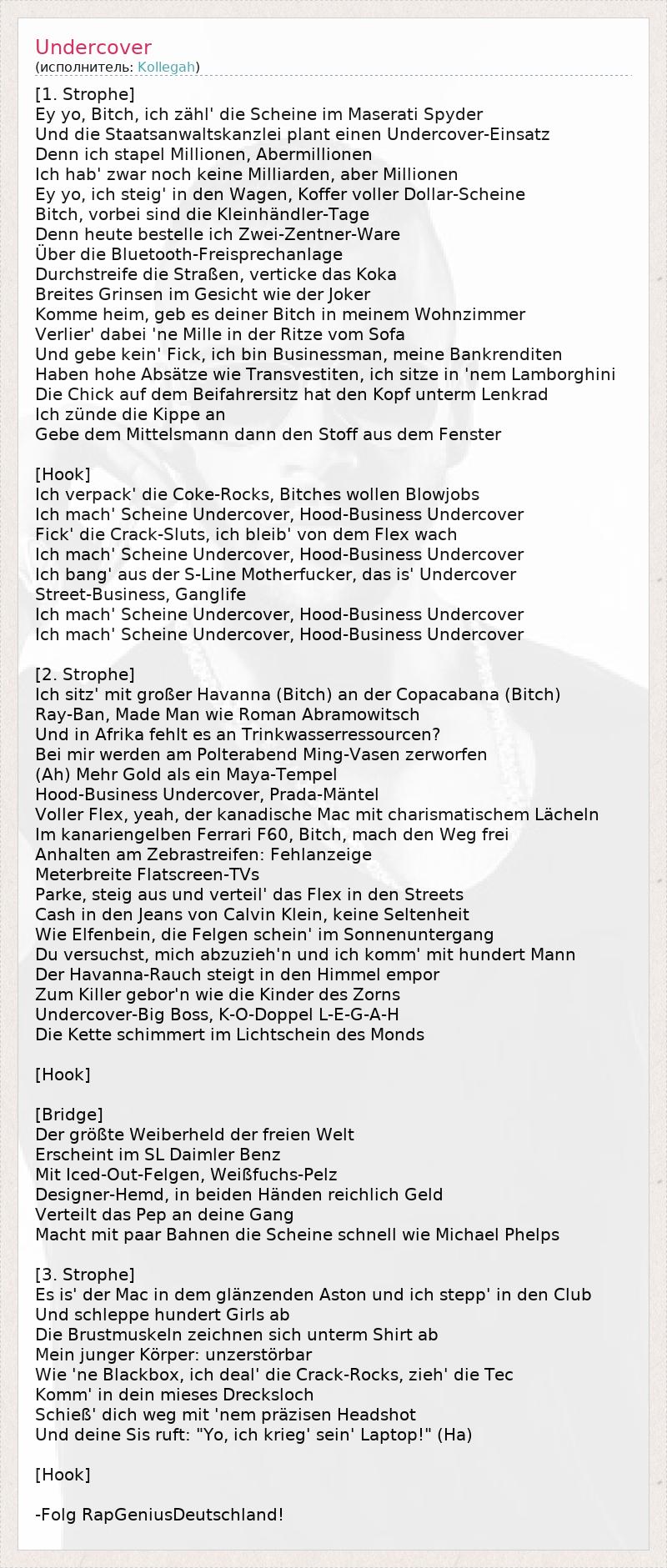 [1. Strophe] Ey yo, Bitch, ich zähl' die Scheine im Maserati Spyder Und die Staatsanwaltskanzlei plant einen Undercover-Einsatz Denn ich stapel Millionen, Abermillionen Ich hab' zwar noch keine Milliarden, aber Millionen Ey yo, ich steig' in den Wagen, Koffer voller Dollar-Scheine Bitch, vorbei sind die Kleinhändler-Tage Denn heute bestelle ich Zwei-Zentner-Ware Über die Bluetooth-Freisprechanlage Durchstreife die Straßen, verticke das Koka Breites Grinsen im Gesicht wie der Joker Komme heim, geb es deiner Bitch in meinem Wohnzimmer Verlier' dabei 'ne Mille in der Ritze vom Sofa Und gebe kein' Fick, ich bin Businessman, meine Bankrenditen Haben hohe Absätze wie Transvestiten, ich sitze in 'nem Lamborghini Die Chick auf dem Beifahrersitz hat den Kopf unterm Lenkrad Ich zünde die Kippe an Gebe dem Mittelsmann dann den Stoff aus dem Fenster [Hook] Ich verpack' die Coke-Rocks, Bitches wollen Blowjobs Ich mach' Scheine Undercover, Hood-Business Undercover Fick' die Crack-Sluts, ich bleib' von dem Flex wach Ich mach' Scheine Undercover, Hood-Business Undercover Ich bang' aus der S-Line Motherfucker, das is' Undercover Street-Business, Ganglife Ich mach' Scheine Undercover, Hood-Business Undercover Ich mach' Scheine Undercover, Hood-Business Undercover [2. Strophe] Ich sitz' mit großer Havanna (Bitch) an der Copacabana (Bitch) Ray-Ban, Made Man wie Roman Abramowitsch Und in Afrika fehlt es an Trinkwasserressourcen? Bei mir werden am Polterabend Ming-Vasen zerworfen (Ah) Mehr Gold als ein Maya-Tempel Hood-Business Undercover, Prada-Mäntel Voller Flex, yeah, der kanadische Mac mit charismatischem Lächeln Im kanariengelben Ferrari F60, Bitch, mach den Weg frei Anhalten am Zebrastreifen: Fehlanzeige Meterbreite Flatscreen-TVs Parke, steig aus und verteil' das Flex in den Streets Cash in den Jeans von Calvin Klein, keine Seltenheit Wie Elfenbein, die Felgen schein' im Sonnenuntergang Du versuchst, mich abzuzieh'n und ich komm' mit hundert Mann Der Havanna-Rauch steigt in den Himmel empor Zum Killer gebor'n wie die Kinder des Zorns Undercover-Big Boss, K-O-Doppel L-E-G-A-H Die Kette schimmert im Lichtschein des Monds [Hook] [Bridge] Der größte Weiberheld der freien Welt Erscheint im SL Daimler Benz Mit Iced-Out-Felgen, Weißfuchs-Pelz Designer-Hemd, in beiden Händen reichlich Geld Verteilt das Pep an deine Gang Macht mit paar Bahnen die Scheine schnell wie Michael Phelps [3. Strophe] Es is' der Mac in dem glänzenden Aston und ich stepp' in den Club Und schleppe hundert Girls ab Die Brustmuskeln zeichnen sich unterm Shirt ab Mein junger Körper: unzerstörbar Wie 'ne Blackbox, ich deal' die Crack-Rocks, zieh' die Tec Komm' in dein mieses Drecksloch Schieß' dich weg mit 'nem präzisen Headshot Und deine Sis ruft: "Yo, ich krieg' sein' Laptop!" (Ha) [Hook] -Folg RapGeniusDeutschland!
