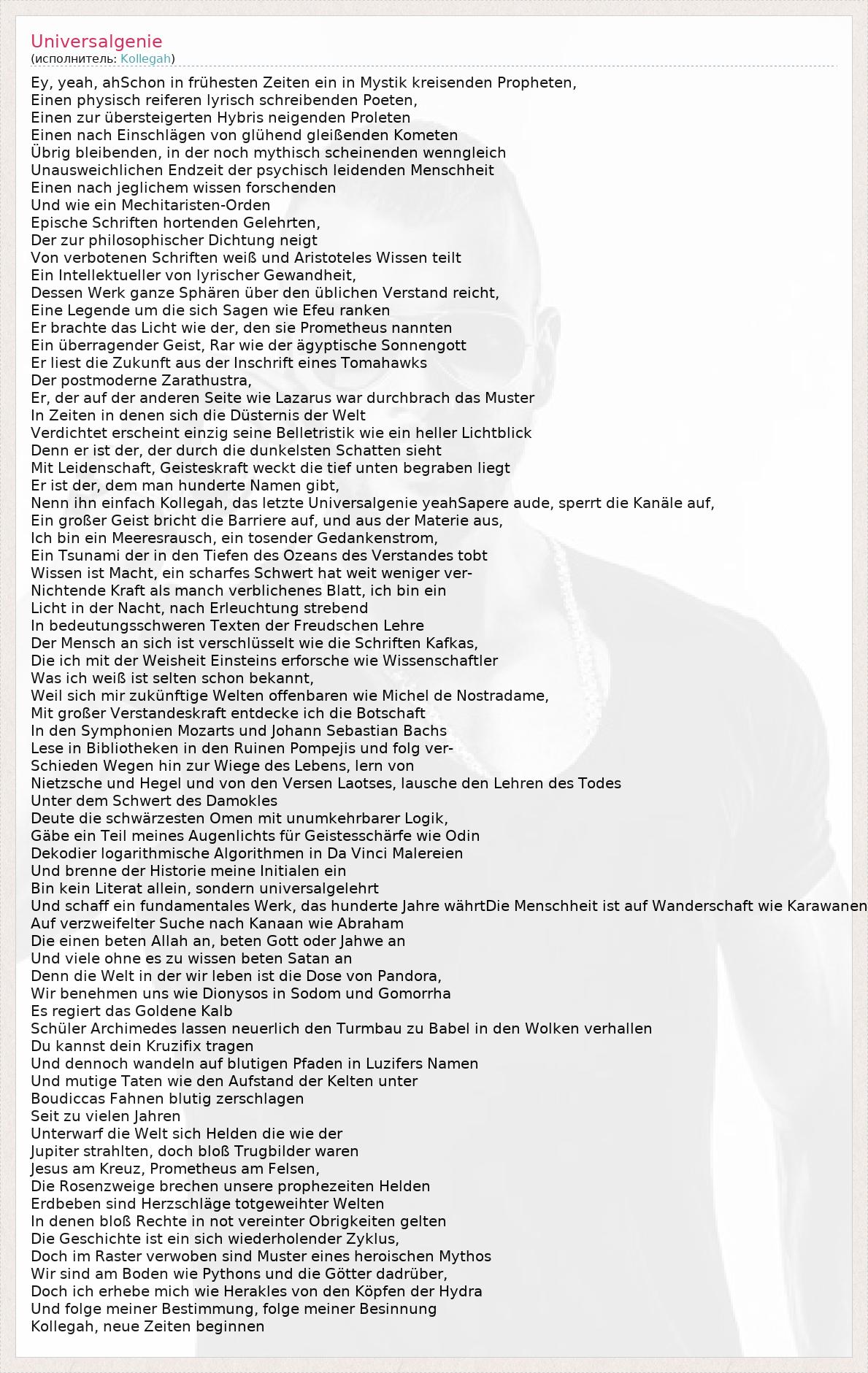 Ey, yeah, ahSchon in frühesten Zeiten ein in Mystik kreisenden Propheten, Einen physisch reiferen lyrisch schreibenden Poeten, Einen zur übersteigerten Hybris neigenden Proleten Einen nach Einschlägen von glühend gleißenden Kometen Übrig bleibenden, in der noch mythisch scheinenden wenngleich Unausweichlichen Endzeit der psychisch leidenden Menschheit Einen nach jeglichem wissen forschenden Und wie ein Mechitaristen-Orden Epische Schriften hortenden Gelehrten, Der zur philosophischer Dichtung neigt Von verbotenen Schriften weiß und Aristoteles Wissen teilt Ein Intellektueller von lyrischer Gewandheit, Dessen Werk ganze Sphären über den üblichen Verstand reicht, Eine Legende um die sich Sagen wie Efeu ranken Er brachte das Licht wie der, den sie Prometheus nannten Ein überragender Geist, Rar wie der ägyptische Sonnengott Er liest die Zukunft aus der Inschrift eines Tomahawks Der postmoderne Zarathustra, Er, der auf der anderen Seite wie Lazarus war durchbrach das Muster In Zeiten in denen sich die Düsternis der Welt Verdichtet erscheint einzig seine Belletristik wie ein heller Lichtblick Denn er ist der, der durch die dunkelsten Schatten sieht Mit Leidenschaft, Geisteskraft weckt die tief unten begraben liegt Er ist der, dem man hunderte Namen gibt, Nenn ihn einfach Kollegah, das letzte Universalgenie yeahSapere aude, sperrt die Kanäle auf, Ein großer Geist bricht die Barriere auf, und aus der Materie aus, Ich bin ein Meeresrausch, ein tosender Gedankenstrom, Ein Tsunami der in den Tiefen des Ozeans des Verstandes tobt Wissen ist Macht, ein scharfes Schwert hat weit weniger ver- Nichtende Kraft als manch verblichenes Blatt, ich bin ein Licht in der Nacht, nach Erleuchtung strebend In bedeutungsschweren Texten der Freudschen Lehre Der Mensch an sich ist verschlüsselt wie die Schriften Kafkas, Die ich mit der Weisheit Einsteins erforsche wie Wissenschaftler Was ich weiß ist selten schon bekannt, Weil sich mir zukünftige Welten offenbaren wie Michel de Nostradame, Mit großer Verstandeskraft entdecke ich die Botschaft In den Symphonien Mozarts und Johann Sebastian Bachs Lese in Bibliotheken in den Ruinen Pompejis und folg ver- Schieden Wegen hin zur Wiege des Lebens, lern von Nietzsche und Hegel und von den Versen Laotses, lausche den Lehren des Todes Unter dem Schwert des Damokles Deute die schwärzesten Omen mit unumkehrbarer Logik, Gäbe ein Teil meines Augenlichts für Geistesschärfe wie Odin Dekodier logarithmische Algorithmen in Da Vinci Malereien Und brenne der Historie meine Initialen ein Bin kein Literat allein, sondern universalgelehrt Und schaff ein fundamentales Werk, das hunderte Jahre währtDie Menschheit ist auf Wanderschaft wie Karawanen Auf verzweifelter Suche nach Kanaan wie Abraham Die einen beten Allah an, beten Gott oder Jahwe an Und viele ohne es zu wissen beten Satan an Denn die Welt in der wir leben ist die Dose von Pandora, Wir benehmen uns wie Dionysos in Sodom und Gomorrha Es regiert das Goldene Kalb Schüler Archimedes lassen neuerlich den Turmbau zu Babel in den Wolken verhallen Du kannst dein Kruzifix tragen Und dennoch wandeln auf blutigen Pfaden in Luzifers Namen Und mutige Taten wie den Aufstand der Kelten unter Boudiccas Fahnen blutig zerschlagen Seit zu vielen Jahren Unterwarf die Welt sich Helden die wie der Jupiter strahlten, doch bloß Trugbilder waren Jesus am Kreuz, Prometheus am Felsen, Die Rosenzweige brechen unsere prophezeiten Helden Erdbeben sind Herzschläge totgeweihter Welten In denen bloß Rechte in not vereinter Obrigkeiten gelten Die Geschichte ist ein sich wiederholender Zyklus, Doch im Raster verwoben sind Muster eines heroischen Mythos Wir sind am Boden wie Pythons und die Götter dadrüber, Doch ich erhebe mich wie Herakles von den Köpfen der Hydra Und folge meiner Bestimmung, folge meiner Besinnung Kollegah, neue Zeiten beginnen