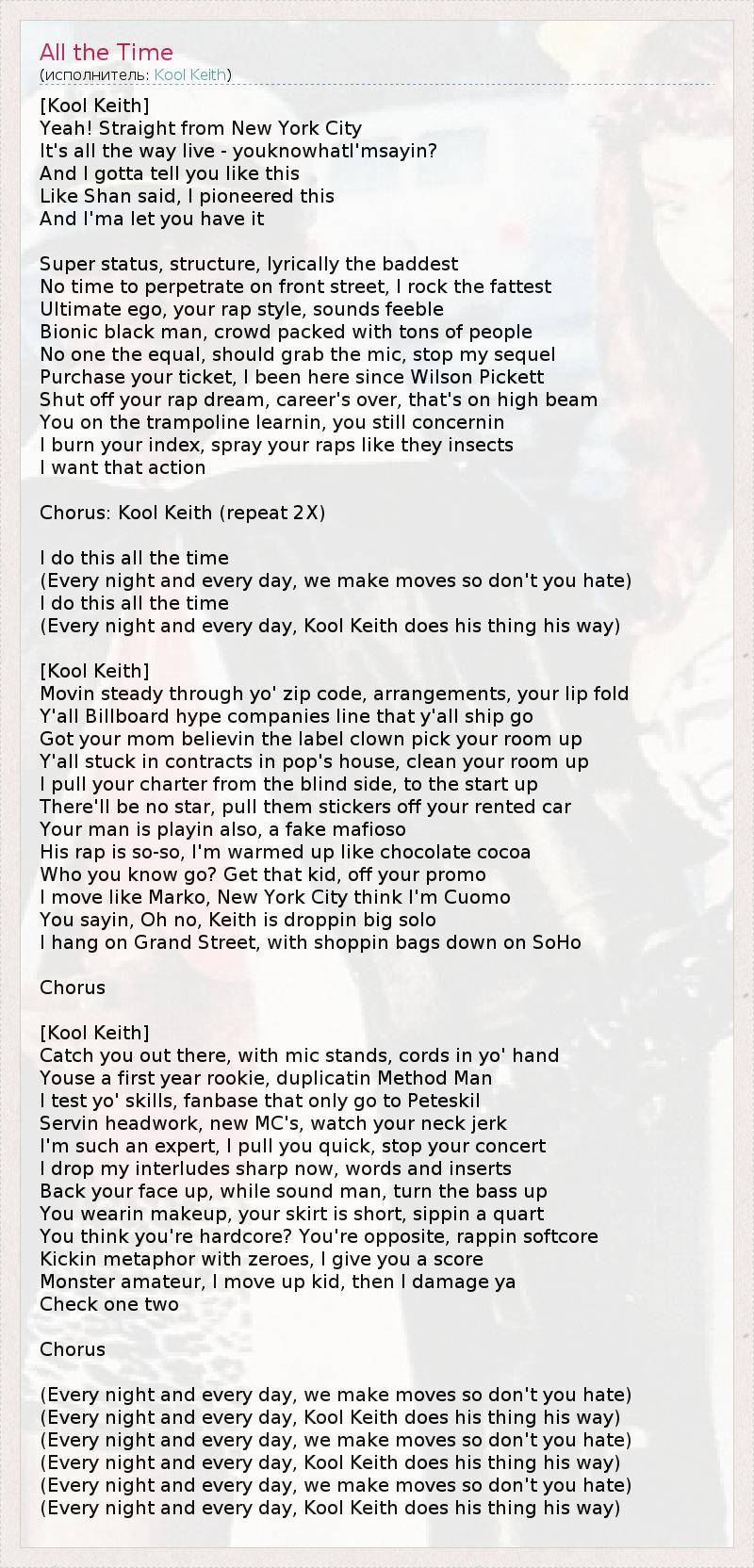 [Kool Keith] Yeah! Straight from New York City It's all the way live - youknowhatI'msayin? And I gotta tell you like this Like Shan said, I pioneered this And I'ma let you have it Super status, structure, lyrically the baddest No time to perpetrate on front street, I rock the fattest Ultimate ego, your rap style, sounds feeble Bionic black man, crowd packed with tons of people No one the equal, should grab the mic, stop my sequel Purchase your ticket, I been here since Wilson Pickett Shut off your rap dream, career's over, that's on high beam You on the trampoline learnin, you still concernin I burn your index, spray your raps like they insects I want that action Chorus: Kool Keith (repeat 2X) I do this all the time (Every night and every day, we make moves so don't you hate) I do this all the time (Every night and every day, Kool Keith does his thing his way) [Kool Keith] Movin steady through yo' zip code, arrangements, your lip fold Y'all Billboard hype companies line that y'all ship go Got your mom believin the label clown pick your room up Y'all stuck in contracts in pop's house, clean your room up I pull your charter from the blind side, to the start up There'll be no star, pull them stickers off your rented car Your man is playin also, a fake mafioso His rap is so-so, I'm warmed up like chocolate cocoa Who you know go? Get that kid, off your promo I move like Marko, New York City think I'm Cuomo You sayin, Oh no, Keith is droppin big solo I hang on Grand Street, with shoppin bags down on SoHo Chorus [Kool Keith] Catch you out there, with mic stands, cords in yo' hand Youse a first year rookie, duplicatin Method Man I test yo' skills, fanbase that only go to Peteskil Servin headwork, new MC's, watch your neck jerk I'm such an expert, I pull you quick, stop your concert I drop my interludes sharp now, words and inserts Back your face up, while sound man, turn the bass up You wearin makeup, your skirt is short, sippin a quart You think you're hardcore? You're opposite, rappin softcore Kickin metaphor with zeroes, I give you a score Monster amateur, I move up kid, then I damage ya Check one two Chorus (Every night and every day, we make moves so don't you hate) (Every night and every day, Kool Keith does his thing his way) (Every night and every day, we make moves so don't you hate) (Every night and every day, Kool Keith does his thing his way) (Every night and every day, we make moves so don't you hate) (Every night and every day, Kool Keith does his thing his way)