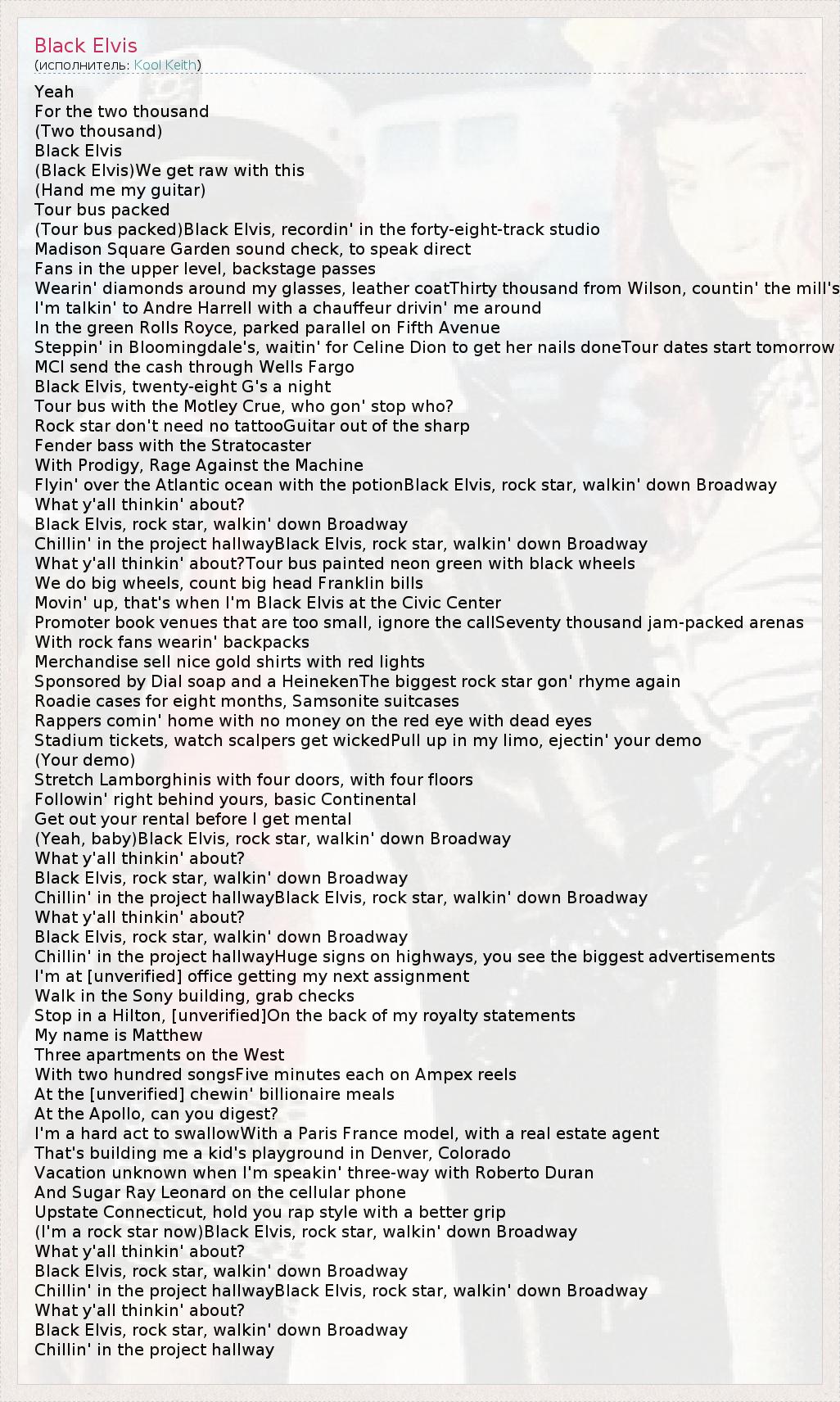 Yeah For the two thousand (Two thousand) Black Elvis (Black Elvis)We get raw with this (Hand me my guitar) Tour bus packed (Tour bus packed)Black Elvis, recordin' in the forty-eight-track studio Madison Square Garden sound check, to speak direct Fans in the upper level, backstage passes Wearin' diamonds around my glasses, leather coatThirty thousand from Wilson, countin' the mill's I'm talkin' to Andre Harrell with a chauffeur drivin' me around In the green Rolls Royce, parked parallel on Fifth Avenue Steppin' in Bloomingdale's, waitin' for Celine Dion to get her nails doneTour dates start tomorrow MCI send the cash through Wells Fargo Black Elvis, twenty-eight G's a night Tour bus with the Motley Crue, who gon' stop who? Rock star don't need no tattooGuitar out of the sharp Fender bass with the Stratocaster With Prodigy, Rage Against the Machine Flyin' over the Atlantic ocean with the potionBlack Elvis, rock star, walkin' down Broadway What y'all thinkin' about? Black Elvis, rock star, walkin' down Broadway Chillin' in the project hallwayBlack Elvis, rock star, walkin' down Broadway What y'all thinkin' about?Tour bus painted neon green with black wheels We do big wheels, count big head Franklin bills Movin' up, that's when I'm Black Elvis at the Civic Center Promoter book venues that are too small, ignore the callSeventy thousand jam-packed arenas With rock fans wearin' backpacks Merchandise sell nice gold shirts with red lights Sponsored by Dial soap and a HeinekenThe biggest rock star gon' rhyme again Roadie cases for eight months, Samsonite suitcases Rappers comin' home with no money on the red eye with dead eyes Stadium tickets, watch scalpers get wickedPull up in my limo, ejectin' your demo (Your demo) Stretch Lamborghinis with four doors, with four floors Followin' right behind yours, basic Continental Get out your rental before I get mental (Yeah, baby)Black Elvis, rock star, walkin' down Broadway What y'all thinkin' about? Black Elvis, rock star, walkin' down Broadway Chillin' in the project hallwayBlack Elvis, rock star, walkin' down Broadway What y'all thinkin' about? Black Elvis, rock star, walkin' down Broadway Chillin' in the project hallwayHuge signs on highways, you see the biggest advertisements I'm at [unverified] office getting my next assignment Walk in the Sony building, grab checks Stop in a Hilton, [unverified]On the back of my royalty statements My name is Matthew Three apartments on the West With two hundred songsFive minutes each on Ampex reels At the [unverified] chewin' billionaire meals At the Apollo, can you digest? I'm a hard act to swallowWith a Paris France model, with a real estate agent That's building me a kid's playground in Denver, Colorado Vacation unknown when I'm speakin' three-way with Roberto Duran And Sugar Ray Leonard on the cellular phone Upstate Connecticut, hold you rap style with a better grip (I'm a rock star now)Black Elvis, rock star, walkin' down Broadway What y'all thinkin' about? Black Elvis, rock star, walkin' down Broadway Chillin' in the project hallwayBlack Elvis, rock star, walkin' down Broadway What y'all thinkin' about? Black Elvis, rock star, walkin' down Broadway Chillin' in the project hallway