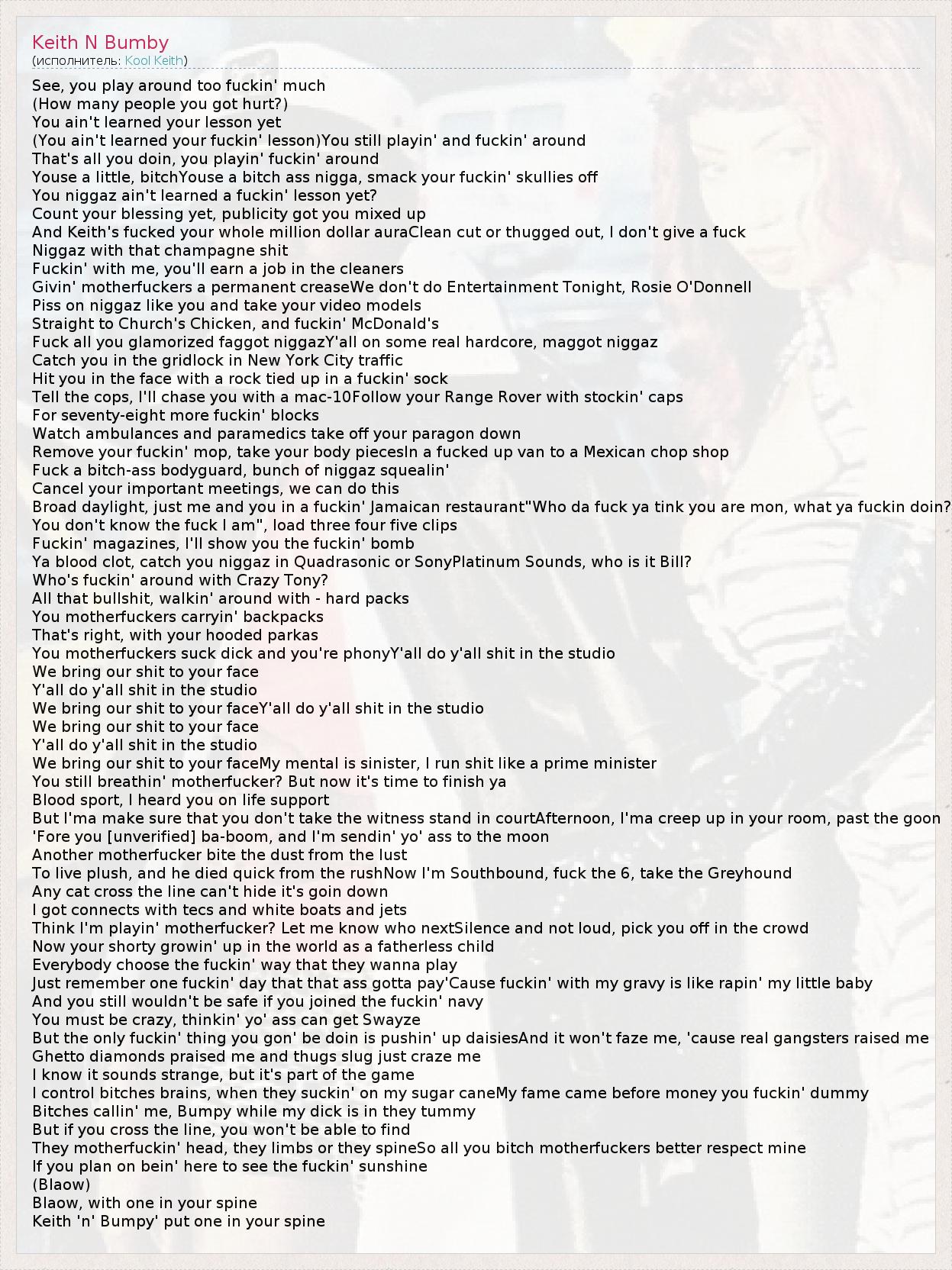 See, you play around too fuckin' much (How many people you got hurt?) You ain't learned your lesson yet (You ain't learned your fuckin' lesson)You still playin' and fuckin' around That's all you doin, you playin' fuckin' around Youse a little, bitchYouse a bitch ass nigga, smack your fuckin' skullies off You niggaz ain't learned a fuckin' lesson yet? Count your blessing yet, publicity got you mixed up And Keith's fucked your whole million dollar auraClean cut or thugged out, I don't give a fuck Niggaz with that champagne shit Fuckin' with me, you'll earn a job in the cleaners Givin' motherfuckers a permanent creaseWe don't do Entertainment Tonight, Rosie O'Donnell Piss on niggaz like you and take your video models Straight to Church's Chicken, and fuckin' McDonald's Fuck all you glamorized faggot niggazY'all on some real hardcore, maggot niggaz Catch you in the gridlock in New York City traffic Hit you in the face with a rock tied up in a fuckin' sock Tell the cops, I'll chase you with a mac-10Follow your Range Rover with stockin' caps For seventy-eight more fuckin' blocks Watch ambulances and paramedics take off your paragon down Remove your fuckin' mop, take your body piecesIn a fucked up van to a Mexican chop shop Fuck a bitch-ass bodyguard, bunch of niggaz squealin' Cancel your important meetings, we can do this Broad daylight, just me and you in a fuckin' Jamaican restaurant"Who da fuck ya tink you are mon, what ya fuckin doin? You don't know the fuck I am", load three four five clips Fuckin' magazines, I'll show you the fuckin' bomb Ya blood clot, catch you niggaz in Quadrasonic or SonyPlatinum Sounds, who is it Bill? Who's fuckin' around with Crazy Tony? All that bullshit, walkin' around with - hard packs You motherfuckers carryin' backpacks That's right, with your hooded parkas You motherfuckers suck dick and you're phonyY'all do y'all shit in the studio We bring our shit to your face Y'all do y'all shit in the studio We bring our shit to your faceY'all do y'all shit in the studio We bring our shit to your face Y'all do y'all shit in the studio We bring our shit to your faceMy mental is sinister, I run shit like a prime minister You still breathin' motherfucker? But now it's time to finish ya Blood sport, I heard you on life support But I'ma make sure that you don't take the witness stand in courtAfternoon, I'ma creep up in your room, past the goon 'Fore you [unverified] ba-boom, and I'm sendin' yo' ass to the moon Another motherfucker bite the dust from the lust To live plush, and he died quick from the rushNow I'm Southbound, fuck the 6, take the Greyhound Any cat cross the line can't hide it's goin down I got connects with tecs and white boats and jets Think I'm playin' motherfucker? Let me know who nextSilence and not loud, pick you off in the crowd Now your shorty growin' up in the world as a fatherless child Everybody choose the fuckin' way that they wanna play Just remember one fuckin' day that that ass gotta pay'Cause fuckin' with my gravy is like rapin' my little baby And you still wouldn't be safe if you joined the fuckin' navy You must be crazy, thinkin' yo' ass can get Swayze But the only fuckin' thing you gon' be doin is pushin' up daisiesAnd it won't faze me, 'cause real gangsters raised me Ghetto diamonds praised me and thugs slug just craze me I know it sounds strange, but it's part of the game I control bitches brains, when they suckin' on my sugar caneMy fame came before money you fuckin' dummy Bitches callin' me, Bumpy while my dick is in they tummy But if you cross the line, you won't be able to find They motherfuckin' head, they limbs or they spineSo all you bitch motherfuckers better respect mine If you plan on bein' here to see the fuckin' sunshine (Blaow) Blaow, with one in your spine Keith 'n' Bumpy' put one in your spine