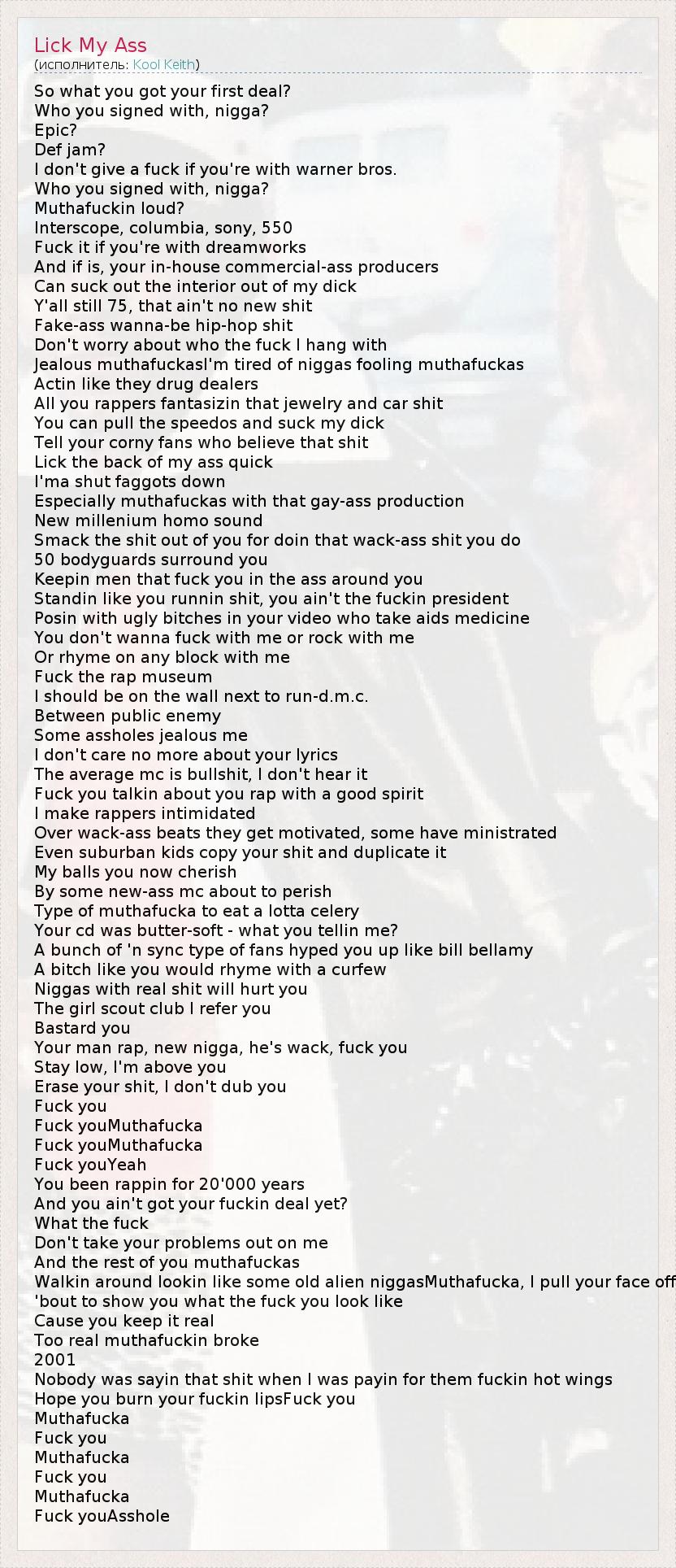 So what you got your first deal? Who you signed with, nigga? Epic? Def jam? I don't give a fuck if you're with warner bros. Who you signed with, nigga? Muthafuckin loud? Interscope, columbia, sony, 550 Fuck it if you're with dreamworks And if is, your in-house commercial-ass producers Can suck out the interior out of my dick Y'all still 75, that ain't no new shit Fake-ass wanna-be hip-hop shit Don't worry about who the fuck I hang with Jealous muthafuckasI'm tired of niggas fooling muthafuckas Actin like they drug dealers All you rappers fantasizin that jewelry and car shit You can pull the speedos and suck my dick Tell your corny fans who believe that shit Lick the back of my ass quick I'ma shut faggots down Especially muthafuckas with that gay-ass production New millenium homo sound Smack the shit out of you for doin that wack-ass shit you do 50 bodyguards surround you Keepin men that fuck you in the ass around you Standin like you runnin shit, you ain't the fuckin president Posin with ugly bitches in your video who take aids medicine You don't wanna fuck with me or rock with me Or rhyme on any block with me Fuck the rap museum I should be on the wall next to run-d.m.c. Between public enemy Some assholes jealous me I don't care no more about your lyrics The average mc is bullshit, I don't hear it Fuck you talkin about you rap with a good spirit I make rappers intimidated Over wack-ass beats they get motivated, some have ministrated Even suburban kids copy your shit and duplicate it My balls you now cherish By some new-ass mc about to perish Type of muthafucka to eat a lotta celery Your cd was butter-soft - what you tellin me? A bunch of 'n sync type of fans hyped you up like bill bellamy A bitch like you would rhyme with a curfew Niggas with real shit will hurt you The girl scout club I refer you Bastard you Your man rap, new nigga, he's wack, fuck you Stay low, I'm above you Erase your shit, I don't dub you Fuck you Fuck youMuthafucka Fuck youMuthafucka Fuck youYeah You been rappin for 20'000 years And you ain't got your fuckin deal yet? What the fuck Don't take your problems out on me And the rest of you muthafuckas Walkin around lookin like some old alien niggasMuthafucka, I pull your face off 'bout to show you what the fuck you look like Cause you keep it real Too real muthafuckin broke 2001 Nobody was sayin that shit when I was payin for them fuckin hot wings Hope you burn your fuckin lipsFuck you Muthafucka Fuck you Muthafucka Fuck you Muthafucka Fuck youAsshole