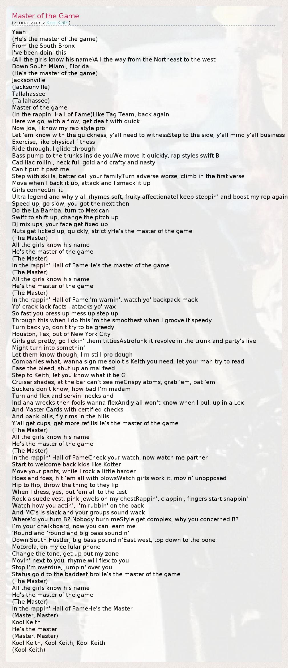 Yeah (He's the master of the game) From the South Bronx I've been doin' this (All the girls know his name)All the way from the Northeast to the west Down South Miami, Florida (He's the master of the game) Jacksonville (Jacksonville) Tallahassee (Tallahassee) Master of the game (In the rappin' Hall of Fame)Like Tag Team, back again Here we go, with a flow, get dealt with quick Now Joe, I know my rap style pro Let 'em know with the quickness, y'all need to witnessStep to the side, y'all mind y'all business Exercise, like physical fitness Ride through, I glide through Bass pump to the trunks inside youWe move it quickly, rap styles swift B Cadillac rollin', neck full gold and crafty and nasty Can't put it past me Step with skills, better call your familyTurn adverse worse, climb in the first verse Move when I back it up, attack and I smack it up Girls connectin' it Ultra legend and why y'all rhymes soft, fruity affectionateI keep steppin' and boost my rep again Speed up, go slow, you got the next then Do the La Bamba, turn to Mexican Swift to shift up, change the pitch up DJ mix ups, your face get fixed up Nuts get licked up, quickly, strictlyHe's the master of the game (The Master) All the girls know his name He's the master of the game (The Master) In the rappin' Hall of FameHe's the master of the game (The Master) All the girls know his name He's the master of the game (The Master) In the rappin' Hall of FameI'm warnin', watch yo' backpack mack Yo' crack lack facts I attacks yo' wax So fast you press up mess up step up Through this when I do thisI'm the smoothest when I groove it speedy Turn back yo, don't try to be greedy Houston, Tex, out of New York City Girls get pretty, go lickin' them tittiesAstrofunk it revolve in the trunk and party's live Might turn into somethin' Let them know though, I'm still pro dough Companies what, wanna sign me soloIt's Keith you need, let your man try to read Ease the bleed, shut up animal feed Step to Keith, let you know what it be G Cruiser shades, at the bar can't see meCrispy atoms, grab 'em, pat 'em Suckers don't know, how bad I'm madam Turn and flex and servin' necks and Indiana wrecks then fools wanna flexAnd y'all won't know when I pull up in a Lex And Master Cards with certified checks And bank bills, fly rims in the hills Y'all get cups, get more refillsHe's the master of the game (The Master) All the girls know his name He's the master of the game (The Master) In the rappin' Hall of FameCheck your watch, now watch me partner Start to welcome back kids like Kotter Move your pants, while I rock a little harder Hoes and foes, hit 'em all with blowsWatch girls work it, movin' unopposed Hip to flip, throw the thing to they lip When I dress, yes, put 'em all to the test Rock a suede vest, pink jewels on my chestRappin', clappin', fingers start snappin' Watch how you actin', I'm rubbin' on the back And MC's is slack and your groups sound wack Where'd you turn B? Nobody burn meStyle get complex, why you concerned B? I'm your chalkboard, now you can learn me 'Round and 'round and big bass soundin' Down South Hustler, big bass poundin'East west, top down to the bone Motorola, on my cellular phone Change the tone, get up out my zone Movin' next to you, rhyme will flex to you Stop I'm overdue, jumpin' over you Status gold to the baddest broHe's the master of the game (The Master) All the girls know his name He's the master of the game (The Master) In the rappin' Hall of FameHe's the Master (Master, Master) Kool Keith He's the master (Master, Master) Kool Keith, Kool Keith, Kool Keith (Kool Keith)