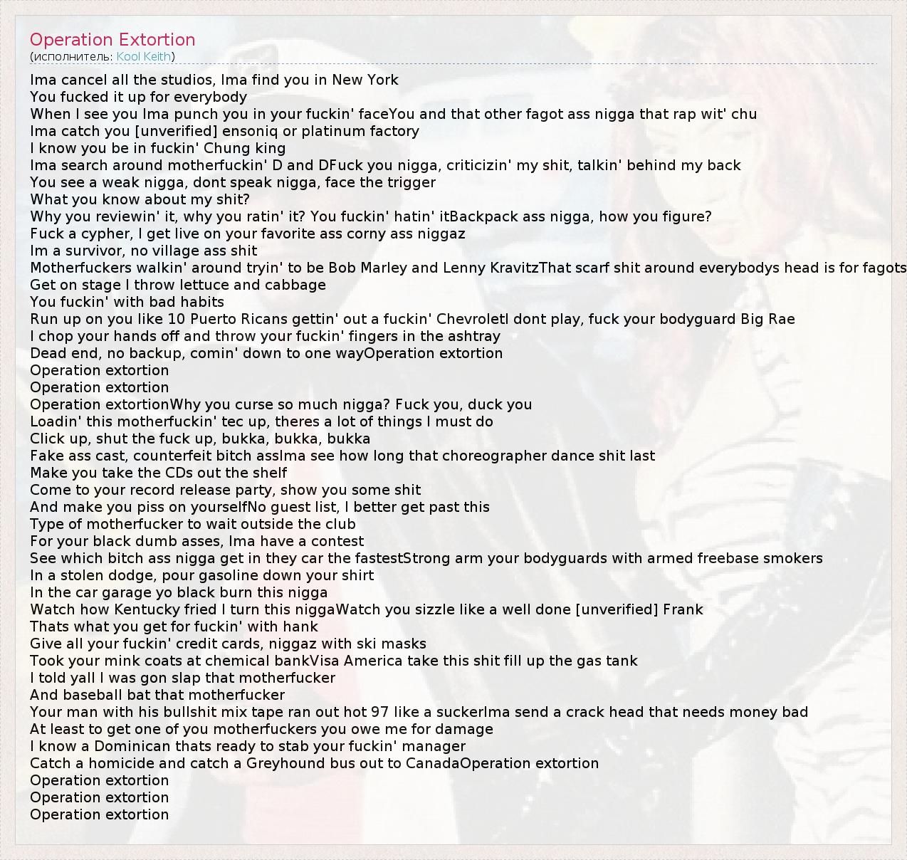 Ima cancel all the studios, Ima find you in New York You fucked it up for everybody When I see you Ima punch you in your fuckin' faceYou and that other fagot ass nigga that rap wit' chu Ima catch you [unverified] ensoniq or platinum factory I know you be in fuckin' Chung king Ima search around motherfuckin' D and DFuck you nigga, criticizin' my shit, talkin' behind my back You see a weak nigga, dont speak nigga, face the trigger What you know about my shit? Why you reviewin' it, why you ratin' it? You fuckin' hatin' itBackpack ass nigga, how you figure? Fuck a cypher, I get live on your favorite ass corny ass niggaz Im a survivor, no village ass shit Motherfuckers walkin' around tryin' to be Bob Marley and Lenny KravitzThat scarf shit around everybodys head is for fagots Get on stage I throw lettuce and cabbage You fuckin' with bad habits Run up on you like 10 Puerto Ricans gettin' out a fuckin' ChevroletI dont play, fuck your bodyguard Big Rae I chop your hands off and throw your fuckin' fingers in the ashtray Dead end, no backup, comin' down to one wayOperation extortion Operation extortion Operation extortion Operation extortionWhy you curse so much nigga? Fuck you, duck you Loadin' this motherfuckin' tec up, theres a lot of things I must do Click up, shut the fuck up, bukka, bukka, bukka Fake ass cast, counterfeit bitch assIma see how long that choreographer dance shit last Make you take the CDs out the shelf Come to your record release party, show you some shit And make you piss on yourselfNo guest list, I better get past this Type of motherfucker to wait outside the club For your black dumb asses, Ima have a contest See which bitch ass nigga get in they car the fastestStrong arm your bodyguards with armed freebase smokers In a stolen dodge, pour gasoline down your shirt In the car garage yo black burn this nigga Watch how Kentucky fried I turn this niggaWatch you sizzle like a well done [unverified] Frank Thats what you get for fuckin' with hank Give all your fuckin' credit cards, niggaz with ski masks Took your mink coats at chemical bankVisa America take this shit fill up the gas tank I told yall I was gon slap that motherfucker And baseball bat that motherfucker Your man with his bullshit mix tape ran out hot 97 like a suckerIma send a crack head that needs money bad At least to get one of you motherfuckers you owe me for damage I know a Dominican thats ready to stab your fuckin' manager Catch a homicide and catch a Greyhound bus out to CanadaOperation extortion Operation extortion Operation extortion Operation extortion