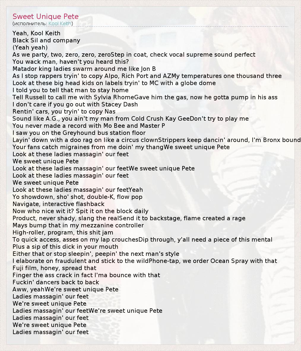 Yeah, Kool Keith Black Sil and company (Yeah yeah) As we party, two, zero, zero, zeroStep in coat, check vocal supreme sound perfect You wack man, haven't you heard this? Matador king ladies swarm around me like Jon B As I stop rappers tryin' to copy Alpo, Rich Port and AZMy temperatures one thousand three Look at these big head kids on labels tryin' to MC with a globe dome I told you to tell that man to stay home Tell Russell to call me with Sylvia RhomeGave him the gas, now he gotta pump in his ass I don't care if you go out with Stacey Dash Rentin' cars, you tryin' to copy Nas Sound like A.G., you ain't my man from Cold Crush Kay GeeDon't try to play me You never made a record with Mo Bee and Master P I saw you on the Greyhound bus station floor Layin' down with a doo rag on like a circus clownStrippers keep dancin' around, I'm Bronx bound Your fans catch migraines from me doin' my thangWe sweet unique Pete Look at these ladies massagin' our feet We sweet unique Pete Look at these ladies massagin' our feetWe sweet unique Pete Look at these ladies massagin' our feet We sweet unique Pete Look at these ladies massagin' our feetYeah Yo showdown, sho' shot, double-K, flow pop Navigate, interactive flashback Now who nice wit it? Spit it on the block daily Product, never shady, slang the realSend it to backstage, flame created a rage Mays bump that in my mezzanine controller High-roller, program, this shit jam To quick access, asses on my lap crouchesDip through, y'all need a piece of this mental Plus a sip of this dick in your mouth Either that or stop sleepin', peepin' the next man's style I elaborate on fraudulent and stick to the wildPhone-tap, we order Ocean Spray with that Fuji film, honey, spread that Finger the ass crack in fact I'ma bounce with that Fuckin' dancers back to back Aww, yeahWe're sweet unique Pete Ladies massagin' our feet We're sweet unique Pete Ladies massagin' our feetWe're sweet unique Pete Ladies massagin' our feet We're sweet unique Pete Ladies massagin' our feet