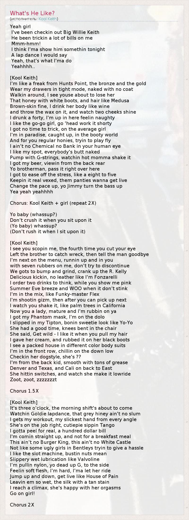 Yeah girl I've been checkin out Big Willie Keith He been trickin a lot of bills on me Mmm-hmm! I think I'ma show him somethin tonight A lap dance I would say Yeah, that's what I'ma do Yeahhhh.. [Kool Keith] I'm like a freak from Hunts Point, the bronze and the gold Wear my drawers in tight mode, naked with no coat Walkin around, I see youse about to lose her That honey with white boots, and hair like Medusa Brown-skin fine, I drink her body like wine and throw the wax on it, and watch two cheeks shine I drunk a forty, I'm up in here feelin naughty I like the go-go girl, go 'head work it shorty I got no time to trick, on the average girl I'm in paradise, caught up, in the booty world And for you regular honies, tryin to play fly I ain't no Chemical no Bank in your human eye I like my spot, everybody's butt naked Pump with G-strings, watchin hot momma shake it I got my beer, viewin from the back rear Yo brotherman, pass it right over here I got to ease off the stress, like a eight to five Keepin it real vexed, them panties wanna get live Change the pace up, yo Jimmy turn the bass up Yea yeah yeahhhh Chorus: Kool Keith + girl (repeat 2X) Yo baby (whassup?) Don't crush it when you sit upon it (Yo baby) whassup? (Don't rush it when I sit upon it) [Kool Keith] I see you scopin me, the fourth time you cut your eye Left the brother to catch wreck, then tell the man goodbye I'm next on the menu, runnin up and in you with seven rubbers on me, don't try to discontinue We gots to bump and grind, crank up the R. Kelly Delicious kickin, no leather like I'm Fonzarelli I order two drinks to think, while you show me pink Summer Eve breeze and WOO when it don't stink I'm in the mix, like Funky-master Flex I'm shootin gizm, then after you can pick up next I watch you shake it, like palm trees in California Now you a lady, mature and I'm rubbin on ya I got my Phantom mask, I'm on the dolo I slipped in my Tipton, bonin sweetie look like Yo-Yo She had a good time, knees bent in the chair She said, Get wild - I like it when you pull my hair I gave her cream, and rubbed it on her black boots I see a packed house in different color body suits I'm in the front row, chillin on the down low Checkin her dogstyle, she's ?? I'm from the back kid, smooth with tons of grease Denver and Texas, and Cali on back to East She hittin switches, and watch she make it lowride Zoot, zoot, zzzzzzzt Chorus 1.5X [Kool Keith] It's three o'clock, the morning shift's about to come Watchin Goldie lapdance, that grey hiney ain't no slum I gets my workout, my slickest hand from every angle She's on the job right, cutiepie sippin Tango I gotta peel for real, a hundred dollar bill I'm comin straight up, and not for a breakfast meal This ain't no Burger King, this ain't no White Castle Not like some ugly girls in Bentleys tryin to give a hassle I like the slot machine, bustin nuts mean Slippery wet lubrication like Valvoline I'm pullin nylon, yo dead up G, to the side Feelin soft flesh, I'm hard, I'ma let her ride Jump up and down, get live like House of Pain Leavin em so wet, the silk with a tan stain I reach a climax, she's happy with her orgasms Go on girl! Chorus 2X