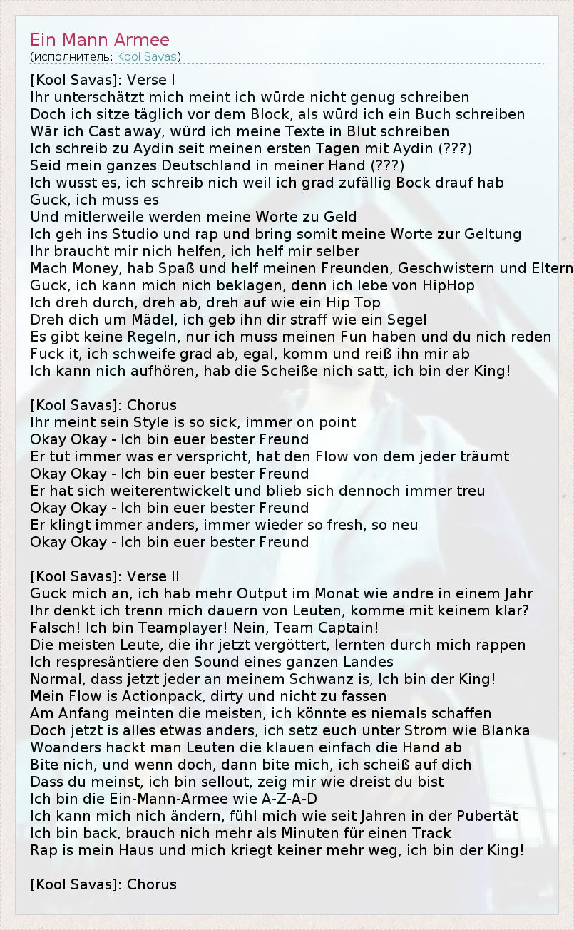 [Kool Savas]: Verse I Ihr unterschätzt mich meint ich würde nicht genug schreiben Doch ich sitze täglich vor dem Block, als würd ich ein Buch schreiben Wär ich Cast away, würd ich meine Texte in Blut schreiben Ich schreib zu Aydin seit meinen ersten Tagen mit Aydin (???) Seid mein ganzes Deutschland in meiner Hand (???) Ich wusst es, ich schreib nich weil ich grad zufällig Bock drauf hab Guck, ich muss es Und mitlerweile werden meine Worte zu Geld Ich geh ins Studio und rap und bring somit meine Worte zur Geltung Ihr braucht mir nich helfen, ich helf mir selber Mach Money, hab Spaß und helf meinen Freunden, Geschwistern und Eltern Guck, ich kann mich nich beklagen, denn ich lebe von HipHop Ich dreh durch, dreh ab, dreh auf wie ein Hip Top Dreh dich um Mädel, ich geb ihn dir straff wie ein Segel Es gibt keine Regeln, nur ich muss meinen Fun haben und du nich reden Fuck it, ich schweife grad ab, egal, komm und reiß ihn mir ab Ich kann nich aufhören, hab die Scheiße nich satt, ich bin der King! [Kool Savas]: Chorus Ihr meint sein Style is so sick, immer on point Okay Okay - Ich bin euer bester Freund Er tut immer was er verspricht, hat den Flow von dem jeder träumt Okay Okay - Ich bin euer bester Freund Er hat sich weiterentwickelt und blieb sich dennoch immer treu Okay Okay - Ich bin euer bester Freund Er klingt immer anders, immer wieder so fresh, so neu Okay Okay - Ich bin euer bester Freund [Kool Savas]: Verse II Guck mich an, ich hab mehr Output im Monat wie andre in einem Jahr Ihr denkt ich trenn mich dauern von Leuten, komme mit keinem klar? Falsch! Ich bin Teamplayer! Nein, Team Captain! Die meisten Leute, die ihr jetzt vergöttert, lernten durch mich rappen Ich respresäntiere den Sound eines ganzen Landes Normal, dass jetzt jeder an meinem Schwanz is, Ich bin der King! Mein Flow is Actionpack, dirty und nicht zu fassen Am Anfang meinten die meisten, ich könnte es niemals schaffen Doch jetzt is alles etwas anders, ich setz euch unter Strom wie Blanka Woanders hackt man Leuten die klauen einfach die Hand ab Bite nich, und wenn doch, dann bite mich, ich scheiß auf dich Dass du meinst, ich bin sellout, zeig mir wie dreist du bist Ich bin die Ein-Mann-Armee wie A-Z-A-D Ich kann mich nich ändern, fühl mich wie seit Jahren in der Pubertät Ich bin back, brauch nich mehr als Minuten für einen Track Rap is mein Haus und mich kriegt keiner mehr weg, ich bin der King! [Kool Savas]: Chorus