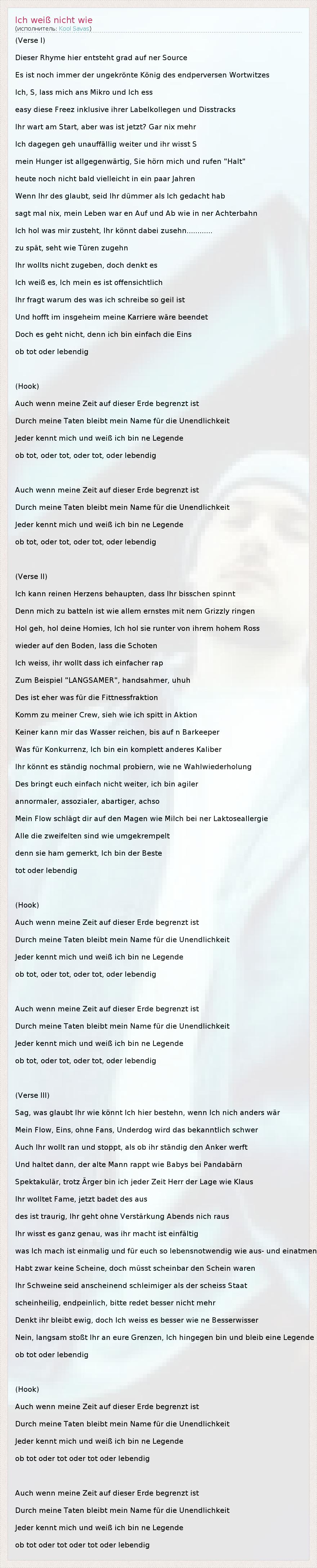 (Verse I) Dieser Rhyme hier entsteht grad auf ner Source Es ist noch immer der ungekrönte König des endperversen Wortwitzes Ich, S, lass mich ans Mikro und Ich ess easy diese Freez inklusive ihrer Labelkollegen und Disstracks Ihr wart am Start, aber was ist jetzt? Gar nix mehr Ich dagegen geh unauffällig weiter und ihr wisst S mein Hunger ist allgegenwärtig, Sie hörn mich und rufen "Halt" heute noch nicht bald vielleicht in ein paar Jahren Wenn Ihr des glaubt, seid Ihr dümmer als Ich gedacht hab sagt mal nix, mein Leben war en Auf und Ab wie in ner Achterbahn Ich hol was mir zusteht, Ihr könnt dabei zusehn............ zu spät, seht wie Türen zugehn Ihr wollts nicht zugeben, doch denkt es Ich weiß es, Ich mein es ist offensichtlich Ihr fragt warum des was ich schreibe so geil ist Und hofft im insgeheim meine Karriere wäre beendet Doch es geht nicht, denn ich bin einfach die Eins ob tot oder lebendig (Hook) Auch wenn meine Zeit auf dieser Erde begrenzt ist Durch meine Taten bleibt mein Name für die Unendlichkeit Jeder kennt mich und weiß ich bin ne Legende ob tot, oder tot, oder tot, oder lebendig Auch wenn meine Zeit auf dieser Erde begrenzt ist Durch meine Taten bleibt mein Name für die Unendlichkeit Jeder kennt mich und weiß ich bin ne Legende ob tot, oder tot, oder tot, oder lebendig (Verse II) Ich kann reinen Herzens behaupten, dass Ihr bisschen spinnt Denn mich zu batteln ist wie allem ernstes mit nem Grizzly ringen Hol geh, hol deine Homies, Ich hol sie runter von ihrem hohem Ross wieder auf den Boden, lass die Schoten Ich weiss, ihr wollt dass ich einfacher rap Zum Beispiel "LANGSAMER", handsahmer, uhuh Des ist eher was für die Fittnessfraktion Komm zu meiner Crew, sieh wie ich spitt in Aktion Keiner kann mir das Wasser reichen, bis auf n Barkeeper Was für Konkurrenz, Ich bin ein komplett anderes Kaliber Ihr könnt es ständig nochmal probiern, wie ne Wahlwiederholung Des bringt euch einfach nicht weiter, ich bin agiler annormaler, assozialer, abartiger, achso Mein Flow schlägt dir auf den Magen wie Milch bei ner Laktoseallergie Alle die zweifelten sind wie umgekrempelt denn sie ham gemerkt, Ich bin der Beste tot oder lebendig (Hook) Auch wenn meine Zeit auf dieser Erde begrenzt ist Durch meine Taten bleibt mein Name für die Unendlichkeit Jeder kennt mich und weiß ich bin ne Legende ob tot, oder tot, oder tot, oder lebendig Auch wenn meine Zeit auf dieser Erde begrenzt ist Durch meine Taten bleibt mein Name für die Unendlichkeit Jeder kennt mich und weiß ich bin ne Legende ob tot, oder tot, oder tot, oder lebendig (Verse III) Sag, was glaubt Ihr wie könnt Ich hier bestehn, wenn Ich nich anders wär Mein Flow, Eins, ohne Fans, Underdog wird das bekanntlich schwer Auch Ihr wollt ran und stoppt, als ob ihr ständig den Anker werft Und haltet dann, der alte Mann rappt wie Babys bei Pandabärn Spektakulär, trotz Ärger bin ich jeder Zeit Herr der Lage wie Klaus Ihr wolltet Fame, jetzt badet des aus des ist traurig, Ihr geht ohne Verstärkung Abends nich raus Ihr wisst es ganz genau, was ihr macht ist einfältig was Ich mach ist einmalig und für euch so lebensnotwendig wie aus- und einatmen Habt zwar keine Scheine, doch müsst scheinbar den Schein waren Ihr Schweine seid anscheinend schleimiger als der scheiss Staat scheinheilig, endpeinlich, bitte redet besser nicht mehr Denkt ihr bleibt ewig, doch Ich weiss es besser wie ne Besserwisser Nein, langsam stoßt Ihr an eure Grenzen, Ich hingegen bin und bleib eine Legende ob tot oder lebendig (Hook) Auch wenn meine Zeit auf dieser Erde begrenzt ist Durch meine Taten bleibt mein Name für die Unendlichkeit Jeder kennt mich und weiß ich bin ne Legende ob tot oder tot oder tot oder lebendig Auch wenn meine Zeit auf dieser Erde begrenzt ist Durch meine Taten bleibt mein Name für die Unendlichkeit Jeder kennt mich und weiß ich bin ne Legende ob tot oder tot oder tot oder lebendig