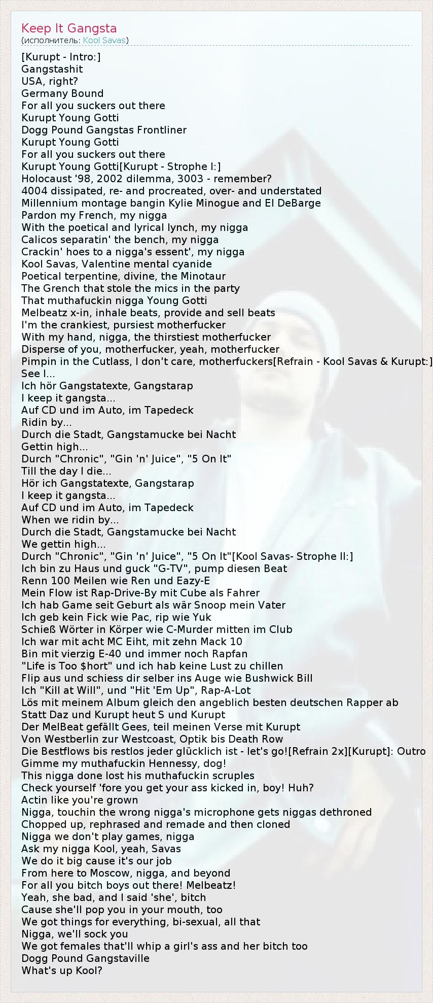 [Kurupt - Intro:] Gangstashit USA, right? Germany Bound For all you suckers out there Kurupt Young Gotti Dogg Pound Gangstas Frontliner Kurupt Young Gotti For all you suckers out there Kurupt Young Gotti[Kurupt - Strophe I:] Holocaust '98, 2002 dilemma, 3003 - remember? 4004 dissipated, re- and procreated, over- and understated Millennium montage bangin Kylie Minogue and El DeBarge Pardon my French, my nigga With the poetical and lyrical lynch, my nigga Calicos separatin' the bench, my nigga Crackin' hoes to a nigga's essent', my nigga Kool Savas, Valentine mental cyanide Poetical terpentine, divine, the Minotaur The Grench that stole the mics in the party That muthafuckin nigga Young Gotti Melbeatz x-in, inhale beats, provide and sell beats I'm the crankiest, pursiest motherfucker With my hand, nigga, the thirstiest motherfucker Disperse of you, motherfucker, yeah, motherfucker Pimpin in the Cutlass, I don't care, motherfuckers[Refrain - Kool Savas & Kurupt:] See I... Ich hör Gangstatexte, Gangstarap I keep it gangsta... Auf CD und im Auto, im Tapedeck Ridin by... Durch die Stadt, Gangstamucke bei Nacht Gettin high... Durch "Chronic", "Gin 'n' Juice", "5 On It" Till the day I die... Hör ich Gangstatexte, Gangstarap I keep it gangsta... Auf CD und im Auto, im Tapedeck When we ridin by... Durch die Stadt, Gangstamucke bei Nacht We gettin high... Durch "Chronic", "Gin 'n' Juice", "5 On It"[Kool Savas- Strophe II:] Ich bin zu Haus und guck "G-TV", pump diesen Beat Renn 100 Meilen wie Ren und Eazy-E Mein Flow ist Rap-Drive-By mit Cube als Fahrer Ich hab Game seit Geburt als wär Snoop mein Vater Ich geb kein Fick wie Pac, rip wie Yuk Schieß Wörter in Körper wie C-Murder mitten im Club Ich war mit acht MC Eiht, mit zehn Mack 10 Bin mit vierzig E-40 und immer noch Rapfan "Life is Too $hort" und ich hab keine Lust zu chillen Flip aus und schiess dir selber ins Auge wie Bushwick Bill Ich "Kill at Will", und "Hit 'Em Up", Rap-A-Lot Lös mit meinem Album gleich den angeblich besten deutschen Rapper ab Statt Daz und Kurupt heut S und Kurupt Der MelBeat gefällt Gees, teil meinen Verse mit Kurupt Von Westberlin zur Westcoast, Optik bis Death Row Die Bestflows bis restlos jeder glücklich ist - let's go![Refrain 2x][Kurupt]: Outro Gimme my muthafuckin Hennessy, dog! This nigga done lost his muthafuckin scruples Check yourself 'fore you get your ass kicked in, boy! Huh? Actin like you're grown Nigga, touchin the wrong nigga's microphone gets niggas dethroned Chopped up, rephrased and remade and then cloned Nigga we don't play games, nigga Ask my nigga Kool, yeah, Savas We do it big cause it's our job From here to Moscow, nigga, and beyond For all you bitch boys out there! Melbeatz! Yeah, she bad, and I said 'she', bitch Cause she'll pop you in your mouth, too We got things for everything, bi-sexual, all that Nigga, we'll sock you We got females that'll whip a girl's ass and her bitch too Dogg Pound Gangstaville What's up Kool?