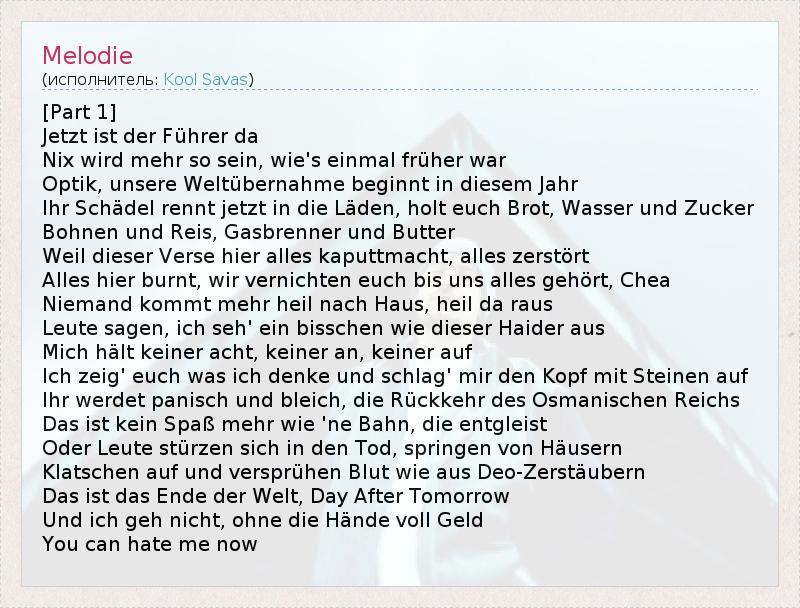 [Part 1] Jetzt ist der Führer da Nix wird mehr so sein, wie's einmal früher war Optik, unsere Weltübernahme beginnt in diesem Jahr Ihr Schädel rennt jetzt in die Läden, holt euch Brot, Wasser und Zucker Bohnen und Reis, Gasbrenner und Butter Weil dieser Verse hier alles kaputtmacht, alles zerstört Alles hier burnt, wir vernichten euch bis uns alles gehört, Chea Niemand kommt mehr heil nach Haus, heil da raus Leute sagen, ich seh' ein bisschen wie dieser Haider aus Mich hält keiner acht, keiner an, keiner auf Ich zeig' euch was ich denke und schlag' mir den Kopf mit Steinen auf Ihr werdet panisch und bleich, die Rückkehr des Osmanischen Reichs Das ist kein Spaß mehr wie 'ne Bahn, die entgleist Oder Leute stürzen sich in den Tod, springen von Häusern Klatschen auf und versprühen Blut wie aus Deo-Zerstäubern Das ist das Ende der Welt, Day After Tomorrow Und ich geh nicht, ohne die Hände voll Geld You can hate me now