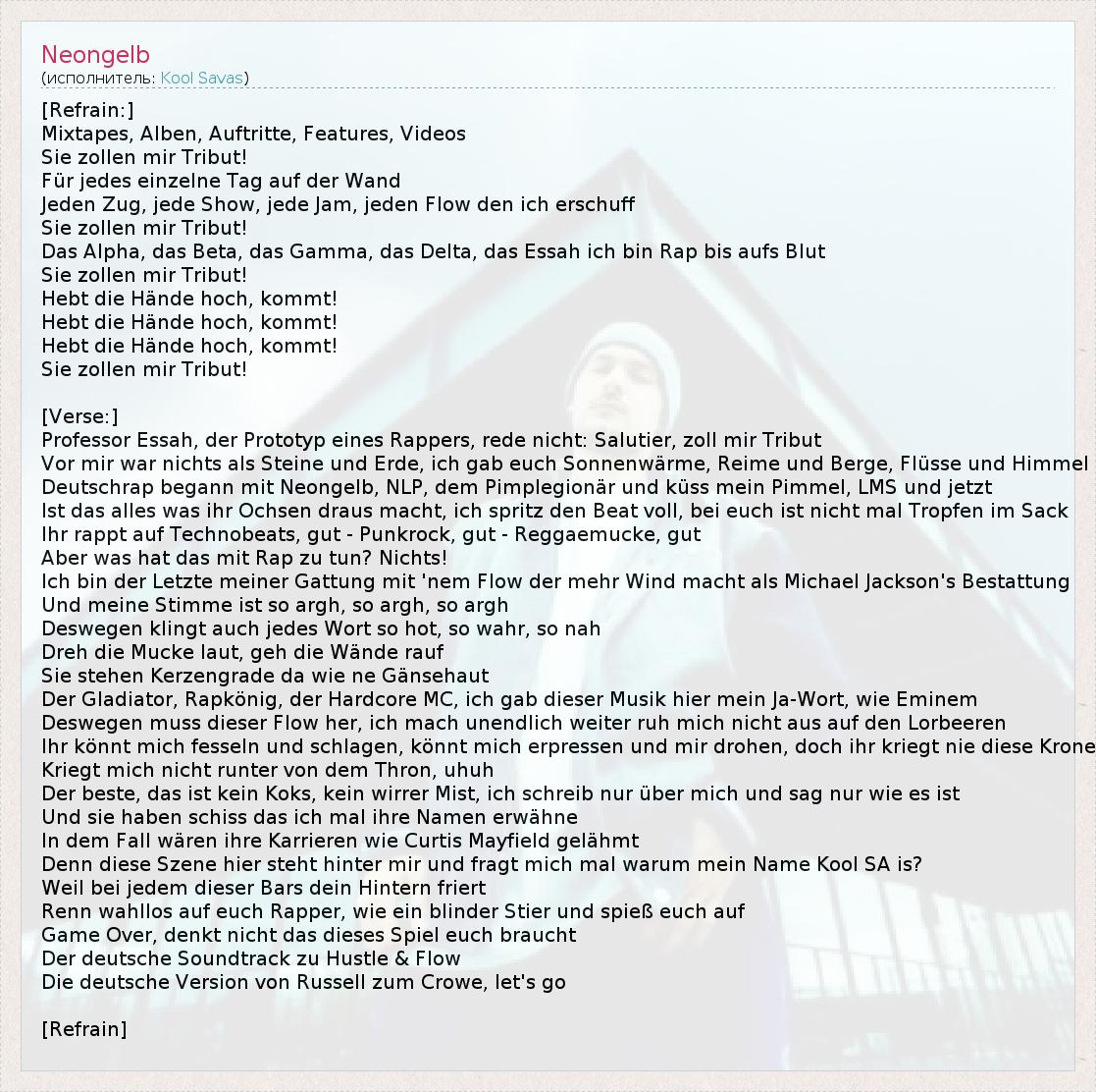 [Refrain:] Mixtapes, Alben, Auftritte, Features, Videos Sie zollen mir Tribut! Für jedes einzelne Tag auf der Wand Jeden Zug, jede Show, jede Jam, jeden Flow den ich erschuff Sie zollen mir Tribut! Das Alpha, das Beta, das Gamma, das Delta, das Essah ich bin Rap bis aufs Blut Sie zollen mir Tribut! Hebt die Hände hoch, kommt! Hebt die Hände hoch, kommt! Hebt die Hände hoch, kommt! Sie zollen mir Tribut! [Verse:] Professor Essah, der Prototyp eines Rappers, rede nicht: Salutier, zoll mir Tribut Vor mir war nichts als Steine und Erde, ich gab euch Sonnenwärme, Reime und Berge, Flüsse und Himmel Deutschrap begann mit Neongelb, NLP, dem Pimplegionär und küss mein Pimmel, LMS und jetzt Ist das alles was ihr Ochsen draus macht, ich spritz den Beat voll, bei euch ist nicht mal Tropfen im Sack Ihr rappt auf Technobeats, gut - Punkrock, gut - Reggaemucke, gut Aber was hat das mit Rap zu tun? Nichts! Ich bin der Letzte meiner Gattung mit 'nem Flow der mehr Wind macht als Michael Jackson's Bestattung Und meine Stimme ist so argh, so argh, so argh Deswegen klingt auch jedes Wort so hot, so wahr, so nah Dreh die Mucke laut, geh die Wände rauf Sie stehen Kerzengrade da wie ne Gänsehaut Der Gladiator, Rapkönig, der Hardcore MC, ich gab dieser Musik hier mein Ja-Wort, wie Eminem Deswegen muss dieser Flow her, ich mach unendlich weiter ruh mich nicht aus auf den Lorbeeren Ihr könnt mich fesseln und schlagen, könnt mich erpressen und mir drohen, doch ihr kriegt nie diese Krone Kriegt mich nicht runter von dem Thron, uhuh Der beste, das ist kein Koks, kein wirrer Mist, ich schreib nur über mich und sag nur wie es ist Und sie haben schiss das ich mal ihre Namen erwähne In dem Fall wären ihre Karrieren wie Curtis Mayfield gelähmt Denn diese Szene hier steht hinter mir und fragt mich mal warum mein Name Kool SA is? Weil bei jedem dieser Bars dein Hintern friert Renn wahllos auf euch Rapper, wie ein blinder Stier und spieß euch auf Game Over, denkt nicht das dieses Spiel euch braucht Der deutsche Soundtrack zu Hustle & Flow Die deutsche Version von Russell zum Crowe, let's go [Refrain]
