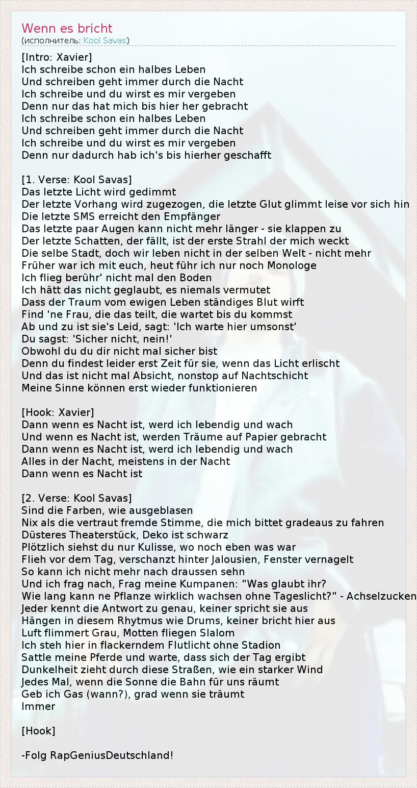 [Intro: Xavier] Ich schreibe schon ein halbes Leben Und schreiben geht immer durch die Nacht Ich schreibe und du wirst es mir vergeben Denn nur das hat mich bis hier her gebracht Ich schreibe schon ein halbes Leben Und schreiben geht immer durch die Nacht Ich schreibe und du wirst es mir vergeben Denn nur dadurch hab ich's bis hierher geschafft [1. Verse: Kool Savas] Das letzte Licht wird gedimmt Der letzte Vorhang wird zugezogen, die letzte Glut glimmt leise vor sich hin Die letzte SMS erreicht den Empfänger Das letzte paar Augen kann nicht mehr länger - sie klappen zu Der letzte Schatten, der fällt, ist der erste Strahl der mich weckt Die selbe Stadt, doch wir leben nicht in der selben Welt - nicht mehr Früher war ich mit euch, heut führ ich nur noch Monologe Ich flieg berühr' nicht mal den Boden Ich hätt das nicht geglaubt, es niemals vermutet Dass der Traum vom ewigen Leben ständiges Blut wirft Find 'ne Frau, die das teilt, die wartet bis du kommst Ab und zu ist sie's Leid, sagt: 'Ich warte hier umsonst' Du sagst: 'Sicher nicht, nein!' Obwohl du du dir nicht mal sicher bist Denn du findest leider erst Zeit für sie, wenn das Licht erlischt Und das ist nicht mal Absicht, nonstop auf Nachtschicht Meine Sinne können erst wieder funktionieren [Hook: Xavier] Dann wenn es Nacht ist, werd ich lebendig und wach Und wenn es Nacht ist, werden Träume auf Papier gebracht Dann wenn es Nacht ist, werd ich lebendig und wach Alles in der Nacht, meistens in der Nacht Dann wenn es Nacht ist [2. Verse: Kool Savas] Sind die Farben, wie ausgeblasen Nix als die vertraut fremde Stimme, die mich bittet gradeaus zu fahren Düsteres Theaterstück, Deko ist schwarz Plötzlich siehst du nur Kulisse, wo noch eben was war Flieh vor dem Tag, verschanzt hinter Jalousien, Fenster vernagelt So kann ich nicht mehr nach draussen sehn Und ich frag nach, Frag meine Kumpanen: "Was glaubt ihr? Wie lang kann ne Pflanze wirklich wachsen ohne Tageslicht?" - Achselzucken Jeder kennt die Antwort zu genau, keiner spricht sie aus Hängen in diesem Rhytmus wie Drums, keiner bricht hier aus Luft flimmert Grau, Motten fliegen Slalom Ich steh hier in flackerndem Flutlicht ohne Stadion Sattle meine Pferde und warte, dass sich der Tag ergibt Dunkelheit zieht durch diese Straßen, wie ein starker Wind Jedes Mal, wenn die Sonne die Bahn für uns räumt Geb ich Gas (wann?), grad wenn sie träumt Immer [Hook] -Folg RapGeniusDeutschland!