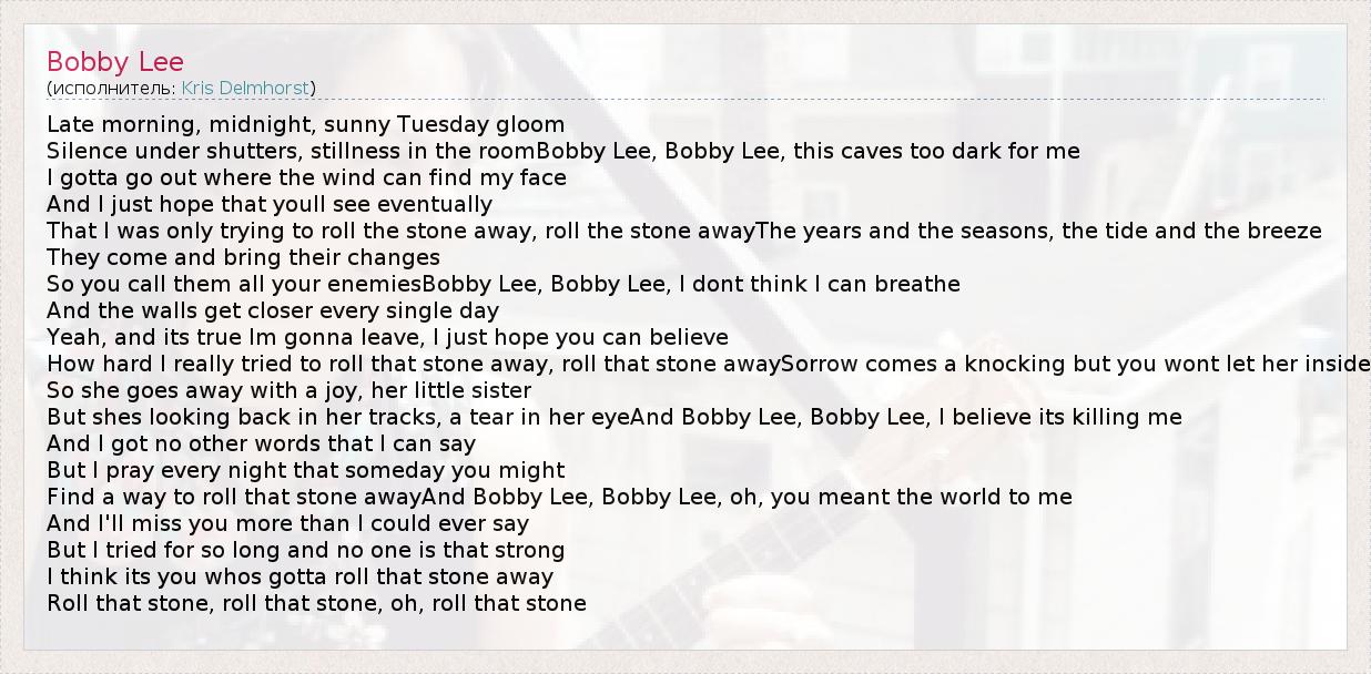 Late morning, midnight, sunny Tuesday gloom Silence under shutters, stillness in the roomBobby Lee, Bobby Lee, this caves too dark for me I gotta go out where the wind can find my face And I just hope that youll see eventually That I was only trying to roll the stone away, roll the stone awayThe years and the seasons, the tide and the breeze They come and bring their changes So you call them all your enemiesBobby Lee, Bobby Lee, I dont think I can breathe And the walls get closer every single day Yeah, and its true Im gonna leave, I just hope you can believe How hard I really tried to roll that stone away, roll that stone awaySorrow comes a knocking but you wont let her inside So she goes away with a joy, her little sister But shes looking back in her tracks, a tear in her eyeAnd Bobby Lee, Bobby Lee, I believe its killing me And I got no other words that I can say But I pray every night that someday you might Find a way to roll that stone awayAnd Bobby Lee, Bobby Lee, oh, you meant the world to me And I'll miss you more than I could ever say But I tried for so long and no one is that strong I think its you whos gotta roll that stone away Roll that stone, roll that stone, oh, roll that stone