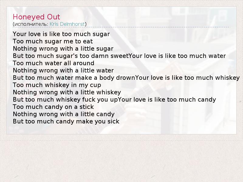 А как ты думаешь, о чем песня "Honeyed Out" ?