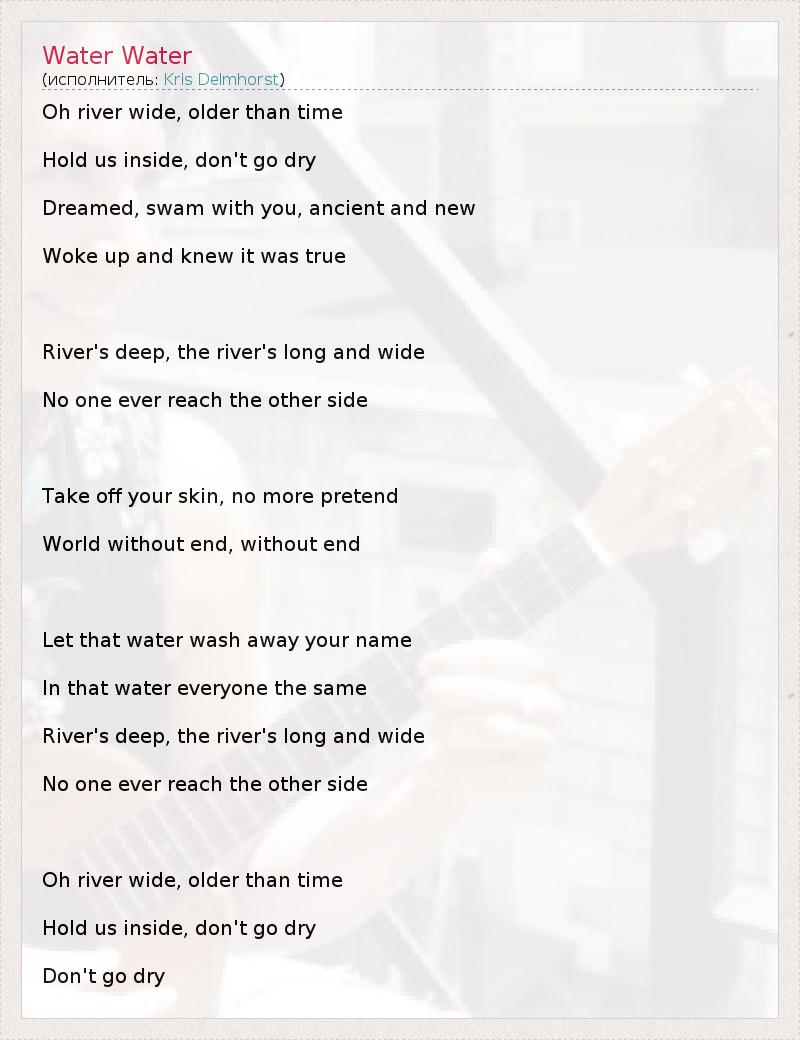 Oh river wide, older than time Hold us inside, don't go dry Dreamed, swam with you, ancient and new Woke up and knew it was true River's deep, the river's long and wide No one ever reach the other side Take off your skin, no more pretend World without end, without end Let that water wash away your name In that water everyone the same River's deep, the river's long and wide No one ever reach the other side Oh river wide, older than time Hold us inside, don't go dry Don't go dry