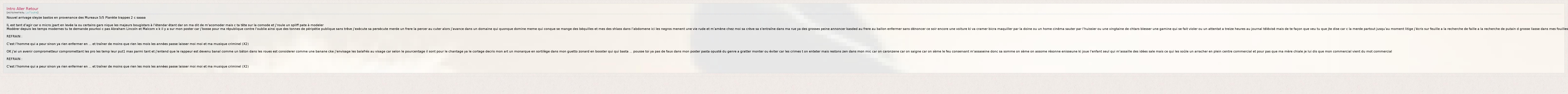 Modérer depuis les temps modernes tu te demande pourkoi c pas Abraham Lincoln et Malcom x k il y a sur mon poster car j'bosse pour ma république contre l'oublie ainsi que des tonnes de péripétie publique sans trêve j’exécute sa persécute merde un frere la percer au cuter alors j'avance dans un domaine qui quonque domine meme qui conque se mange des béquilles et mes des shlass dans l'abdomene ici les negros menent une vie rude et m’amène chez moi sa crève sa s’entraîne dans ma rue ya des grosses peine annoncer kasded au frere au ballon enfermer sans dénoncer ce soir encore une voiture ki va cramer bicra maquiller par la doine ou un home cinéma sauter par l'huissier ou une vingtaine de chtars blesser une gamine qui se fait violer ou un attentat a treize heures au journal télévisé mais de te façon que veu tu que jte dise car c la merde partout jusqu’au moment litige j’écris sur feuille a la recherche de faille a la recherche de putain d grosse liasse dans mes fouilles
