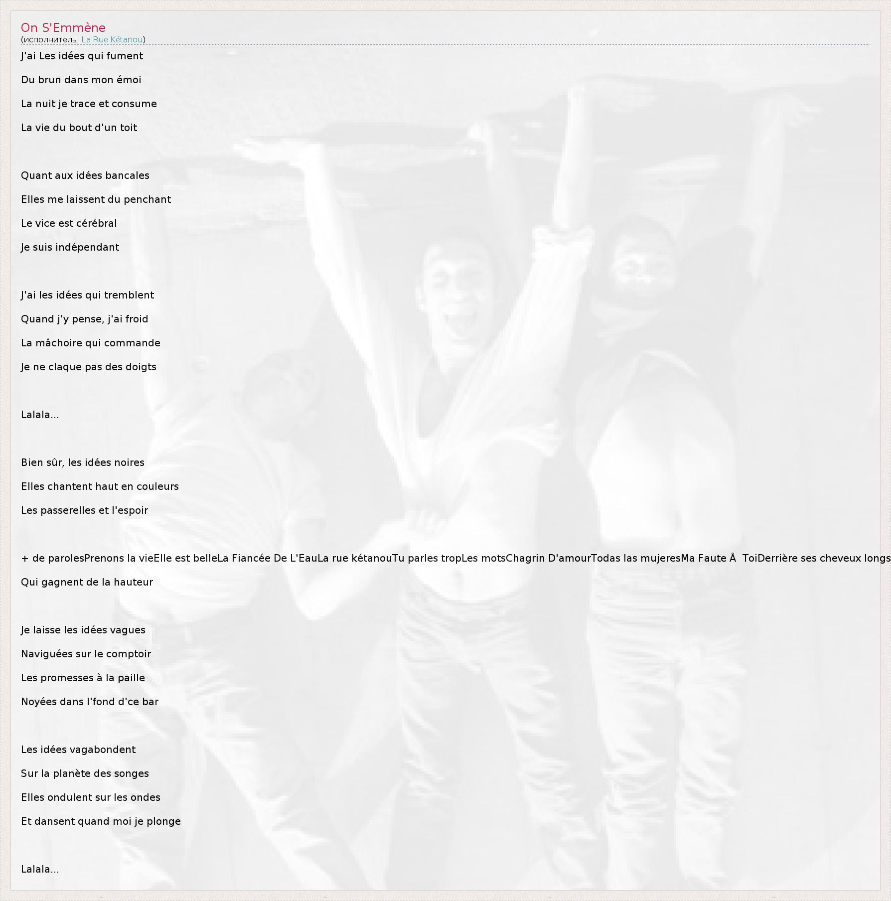 + de parolesPrenons la vieElle est belleLa Fiancée De L'EauLa rue kétanouTu parles tropLes motsChagrin D'amourTodas las mujeresMa Faute à  ToiDerrière ses cheveux longs