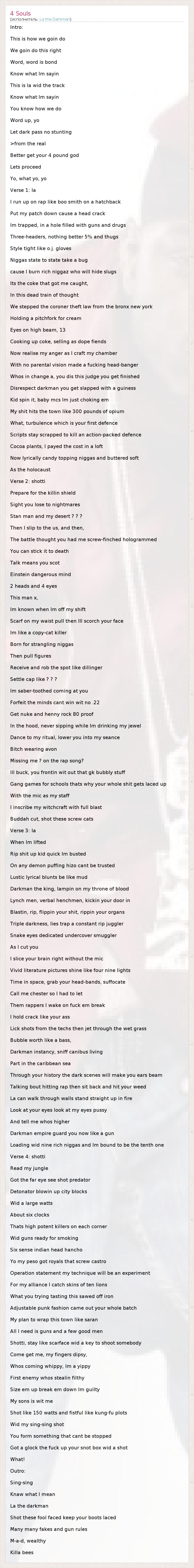 Intro: This is how we goin do We goin do this right Word, word is bond Know what Im sayin This is la wid the track Know what Im sayin You know how we do Word up, yo Let dark pass no stunting >from the real Better get your 4 pound god Lets proceed Yo, what yo, yo Verse 1: la I run up on rap like boo smith on a hatchback Put my patch down cause a head crack Im trapped, in a hole filled with guns and drugs Three-headers, nothing better 5% and thugs Style tight like o.j. gloves Niggas state to state take a bug cause I burn rich niggaz who will hide slugs Its the coke that got me caught, In this dead train of thought We stepped the coroner theft law from the bronx new york Holding a pitchfork for cream Eyes on high beam, 13 Cooking up coke, selling as dope fiends Now realise my anger as I craft my chamber With no parental vision made a fucking head-banger Whos in change a, you dis this judge you get finished Disrespect darkman you get slapped with a guiness Kid spin it, baby mcs Im just choking em My shit hits the town like 300 pounds of opium What, turbulence which is your first defence Scripts stay scrapped to kill an action-packed defence Cocoa plants, I payed the cost in a loft Now lyrically candy topping niggas and buttered soft As the holocaust Verse 2: shotti Prepare for the killin shield Sight you lose to nightmares Stan man and my desert ? ? ? Then I slip to the us, and then, The battle thought you had me screw-finched hologrammed You can stick it to death Talk means you scot Einstein dangerous mind 2 heads and 4 eyes This man x, Im known when Im off my shift Scarf on my waist pull then Ill scorch your face Im like a copy-cat killer Born for strangling niggas Then pull figures Receive and rob the spot like dillinger Settle cap like ? ? ? Im saber-toothed coming at you Forfeit the minds cant win wit no .22 Get nuke and henny rock 80 proof In the hood, never sipping while Im drinking my jewel Dance to my ritual, lower you into my seance Bitch wearing avon Missing me ? on the rap song? Ill buck, you frontin wit out that gk bubbly stuff Gang games for schools thats why your whole shit gets laced up With the mic as my staff I inscribe my witchcraft with full blast Buddah cut, shot these screw cats Verse 3: la When Im lifted Rip shit up kid quick Im busted On any demon puffing hizo cant be trusted Lustic lyrical blunts be like mud Darkman the king, lampin on my throne of blood Lynch men, verbal henchmen, kickin your door in Blastin, rip, flippin your shit, rippin your organs Triple darkness, lies trap a constant rip juggler Snake eyes dedicated undercover smuggler As I cut you I slice your brain right without the mic Vivid literature pictures shine like four nine lights Time in space, grab your head-bands, suffocate Call me chester so I had to let Them rappers I wake on fuck em break I hold crack like your ass Lick shots from the techs then jet through the wet grass Bubble worth like a bass, Darkman instancy, sniff canibus living Part in the caribbean sea Through your history the dark scenes will make you ears beam Talking bout hitting rap then sit back and hit your weed La can walk through walls stand straight up in fire Look at your eyes look at my eyes pussy And tell me whos higher Darkman empire guard you now like a gun Loading wid nine rich niggas and Im bound to be the tenth one Verse 4: shotti Read my jungle Got the far eye see shot predator Detonator blowin up city blocks Wid a large watts About six clocks Thats high potent killers on each corner Wid guns ready for smoking Six sense indian head hancho Yo my peso got royals that screw castro Operation statement my technique will be an experiment For my alliance I catch skins of ten lions What you trying tasting this sawed off iron Adjustable punk fashion came out your whole batch My plan to wrap this town like saran All I need is guns and a few good men Shotti, stay like scarface wid a key to shoot somebody Come get me, my fingers dipsy, Whos coming whippy, Im a yippy First enemy whos stealin filthy Size em up break em down Im guilty My sons is wit me Shot like 150 watts and fistful like kung-fu plots Wid my sing-sing shot You form something that cant be stopped Got a glock the fuck up your snot box wid a shot What! Outro: Sing-sing Knaw what I mean La the darkman Shot these fool faced keep your boots laced Many many fakes and gun rules M-a-d, wealthy Killa bees