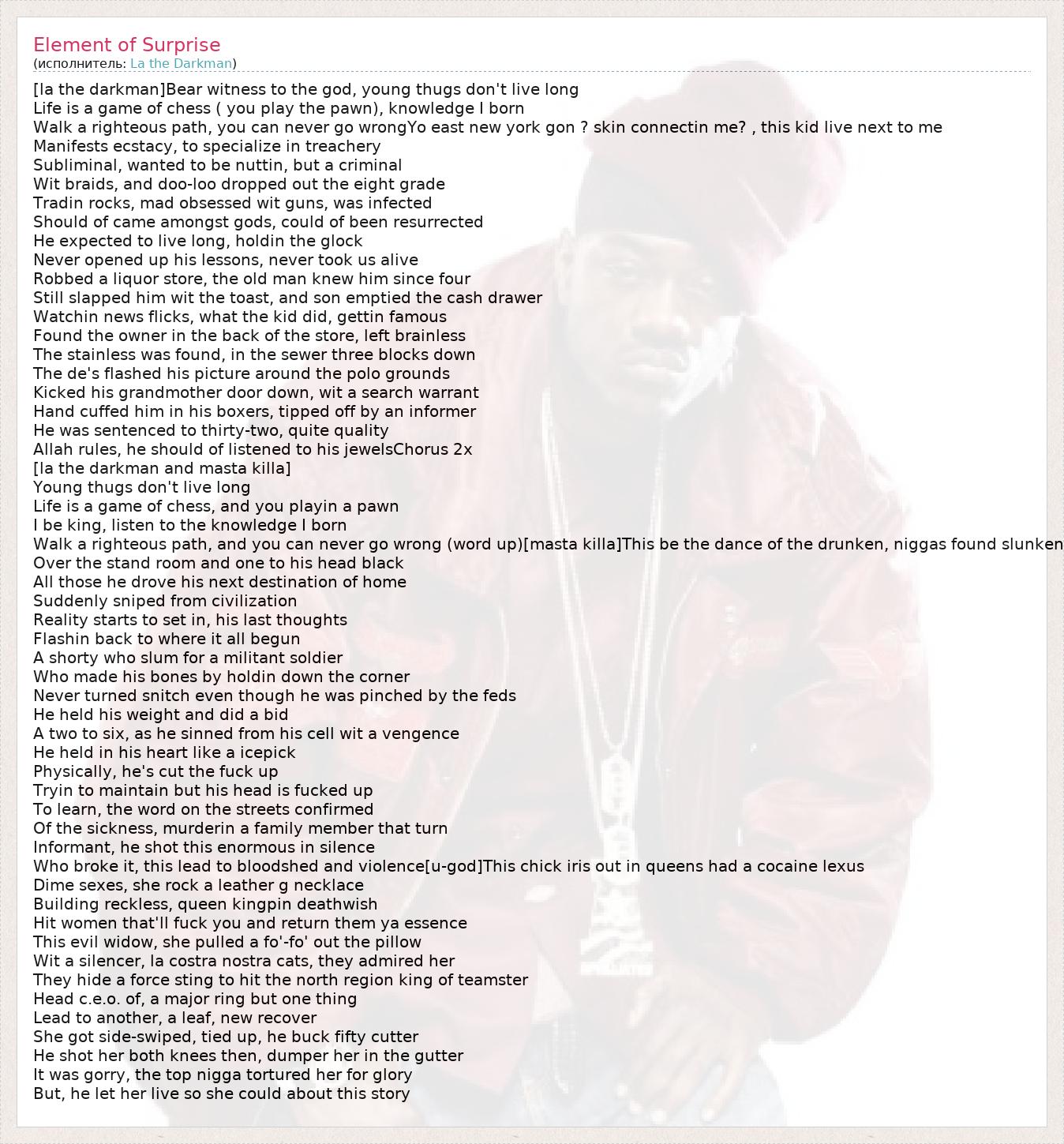 Это интересно:La The Darkman (a.k.a. Triple Darkness) Настоящее имя: Lason Jackson Сольный MC, тесно связанный с Wu-Tang Clan и Wu-Fam. Дебютный сингл был замечен в компиляции-альбоме DJ Muggs presents "Soul Assassins" (Chapter I), который называлася "Devil In A Blue Dress". Дебютный альбом La The Darkman вышел на рынок сбыта 2го Ноября 1998 года под названием "Heist Of The Century". В 1999 году он принял участие в записи 2го сольного альбома Ol' Dirty Bastard "Nigga Please"... продолжение