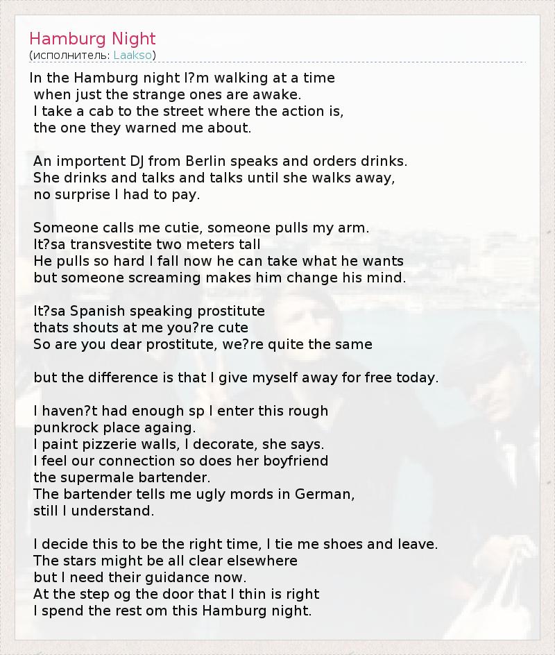 In the Hamburg night I?m walking at a time when just the strange ones are awake. I take a cab to the street where the action is, the one they warned me about. An importent DJ from Berlin speaks and orders drinks. She drinks and talks and talks until she walks away, no surprise I had to pay. Someone calls me cutie, someone pulls my arm. It?sa transvestite two meters tall He pulls so hard I fall now he can take what he wants but someone screaming makes him change his mind. It?sa Spanish speaking prostitute thats shouts at me you?re cute So are you dear prostitute, we?re quite the same but the difference is that I give myself away for free today. I haven?t had enough sp I enter this rough punkrock place againg. I paint pizzerie walls, I decorate, she says. I feel our connection so does her boyfriend the supermale bartender. The bartender tells me ugly mords in German, still I understand. I decide this to be the right time, I tie me shoes and leave. The stars might be all clear elsewhere but I need their guidance now. At the step og the door that I thin is right I spend the rest om this Hamburg night.