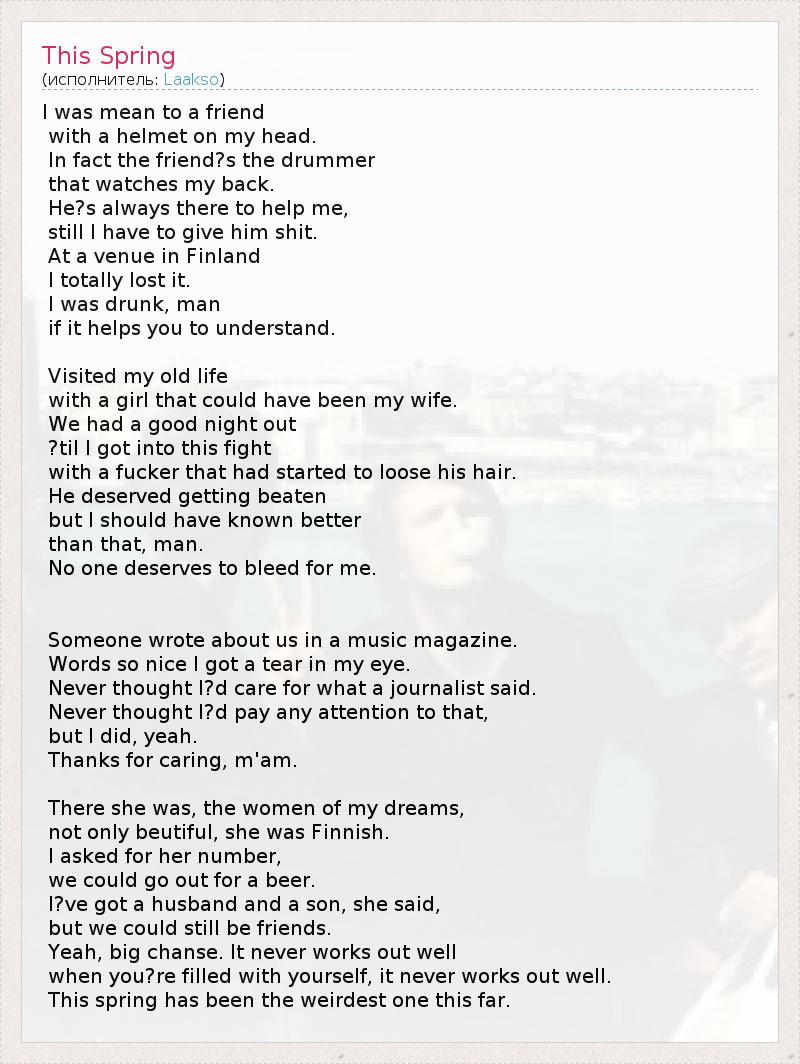 I was mean to a friend with a helmet on my head. In fact the friend?s the drummer that watches my back. He?s always there to help me, still I have to give him shit. At a venue in Finland I totally lost it. I was drunk, man if it helps you to understand. Visited my old life with a girl that could have been my wife. We had a good night out ?til I got into this fight with a fucker that had started to loose his hair. He deserved getting beaten but I should have known better than that, man. No one deserves to bleed for me. Someone wrote about us in a music magazine. Words so nice I got a tear in my eye. Never thought I?d care for what a journalist said. Never thought I?d pay any attention to that, but I did, yeah. Thanks for caring, m'am. There she was, the women of my dreams, not only beutiful, she was Finnish. I asked for her number, we could go out for a beer. I?ve got a husband and a son, she said, but we could still be friends. Yeah, big chanse. It never works out well when you?re filled with yourself, it never works out well. This spring has been the weirdest one this far.