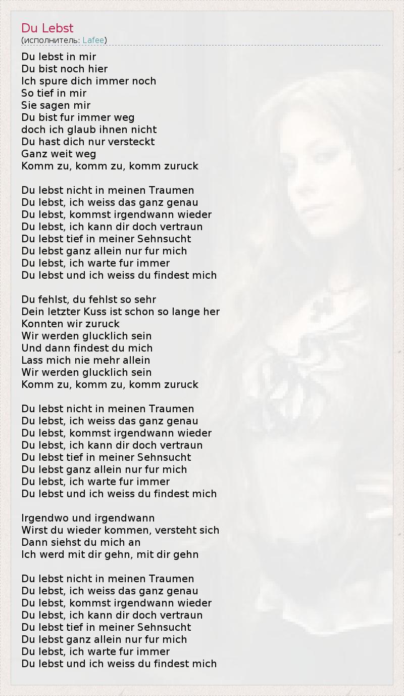 Du lebst in mir Du bist noch hier Ich spure dich immer noch So tief in mir Sie sagen mir Du bist fur immer weg doch ich glaub ihnen nicht Du hast dich nur versteckt Ganz weit weg Komm zu, komm zu, komm zuruck Du lebst nicht in meinen Traumen Du lebst, ich weiss das ganz genau Du lebst, kommst irgendwann wieder Du lebst, ich kann dir doch vertraun Du lebst tief in meiner Sehnsucht Du lebst ganz allein nur fur mich Du lebst, ich warte fur immer Du lebst und ich weiss du findest mich Du fehlst, du fehlst so sehr Dein letzter Kuss ist schon so lange her Konnten wir zuruck Wir werden glucklich sein Und dann findest du mich Lass mich nie mehr allein Wir werden glucklich sein Komm zu, komm zu, komm zuruck Du lebst nicht in meinen Traumen Du lebst, ich weiss das ganz genau Du lebst, kommst irgendwann wieder Du lebst, ich kann dir doch vertraun Du lebst tief in meiner Sehnsucht Du lebst ganz allein nur fur mich Du lebst, ich warte fur immer Du lebst und ich weiss du findest mich Irgendwo und irgendwann Wirst du wieder kommen, versteht sich Dann siehst du mich an Ich werd mit dir gehn, mit dir gehn Du lebst nicht in meinen Traumen Du lebst, ich weiss das ganz genau Du lebst, kommst irgendwann wieder Du lebst, ich kann dir doch vertraun Du lebst tief in meiner Sehnsucht Du lebst ganz allein nur fur mich Du lebst, ich warte fur immer Du lebst und ich weiss du findest mich