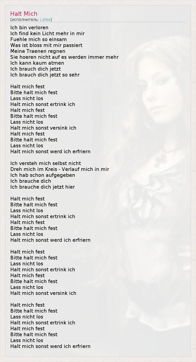 Ich bin verloren Ich find kein Licht mehr in mir Fuehle mich so einsam Was ist bloss mit mir passiert Meine Traenen regnen Sie hoeren nicht auf es werden immer mehr Ich kann kaum atmen Ich brauch dich jetzt Ich brauch dich jetzt so sehr Halt mich fest Bitte halt mich fest Lass nicht los Halt mich sonst ertrink ich Halt mich fest Bitte halt mich fest Lass nicht los Halt mich sonst versink ich Halt mich fest Bitte halt mich fest Lass nicht los Halt mich sonst werd ich erfriern Ich versteh mich selbst nicht Dreh mich im Kreis - Verlauf mich in mir Ich hab schon aufgegeben Ich brauche dich Ich brauche dich jetzt hier Halt mich fest Bitte halt mich fest Lass nicht los Halt mich sonst ertrink ich Halt mich fest Bitte halt mich fest Lass nicht los Halt mich sonst werd ich erfriern Halt mich fest Bitte halt mich fest Lass nicht los Halt mich sonst ertrink ich Halt mich fest Bitte halt mich fest Lass nicht los Halt mich sonst versink ich Halt mich fest Bitte halt mich fest Lass nicht los Halt mich sonst ertrink ich Halt mich fest Bitte halt mich fest Lass nicht los Halt mich sonst werd ich erfriern