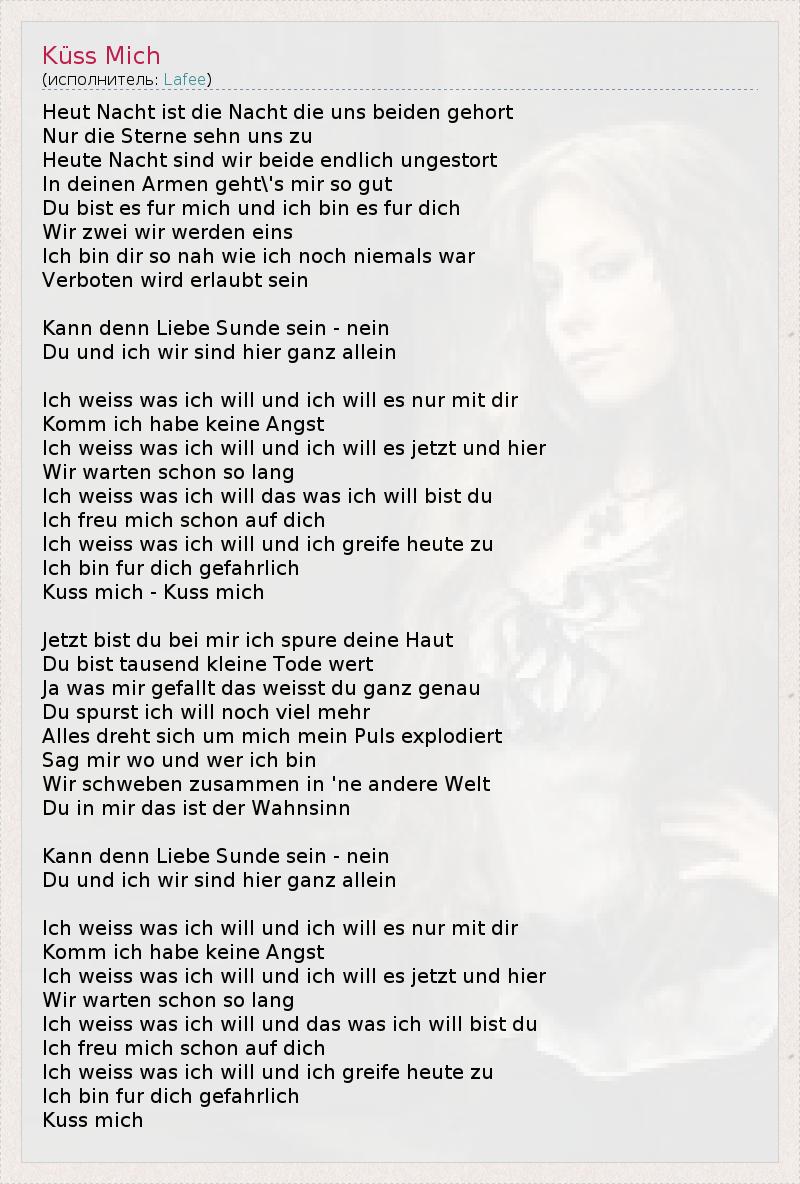 Heut Nacht ist die Nacht die uns beiden gehort Nur die Sterne sehn uns zu Heute Nacht sind wir beide endlich ungestort In deinen Armen geht\'s mir so gut Du bist es fur mich und ich bin es fur dich Wir zwei wir werden eins Ich bin dir so nah wie ich noch niemals war Verboten wird erlaubt sein Kann denn Liebe Sunde sein - nein Du und ich wir sind hier ganz allein Ich weiss was ich will und ich will es nur mit dir Komm ich habe keine Angst Ich weiss was ich will und ich will es jetzt und hier Wir warten schon so lang Ich weiss was ich will das was ich will bist du Ich freu mich schon auf dich Ich weiss was ich will und ich greife heute zu Ich bin fur dich gefahrlich Kuss mich - Kuss mich Jetzt bist du bei mir ich spure deine Haut Du bist tausend kleine Tode wert Ja was mir gefallt das weisst du ganz genau Du spurst ich will noch viel mehr Alles dreht sich um mich mein Puls explodiert Sag mir wo und wer ich bin Wir schweben zusammen in 'ne andere Welt Du in mir das ist der Wahnsinn Kann denn Liebe Sunde sein - nein Du und ich wir sind hier ganz allein Ich weiss was ich will und ich will es nur mit dir Komm ich habe keine Angst Ich weiss was ich will und ich will es jetzt und hier Wir warten schon so lang Ich weiss was ich will und das was ich will bist du Ich freu mich schon auf dich Ich weiss was ich will und ich greife heute zu Ich bin fur dich gefahrlich Kuss mich