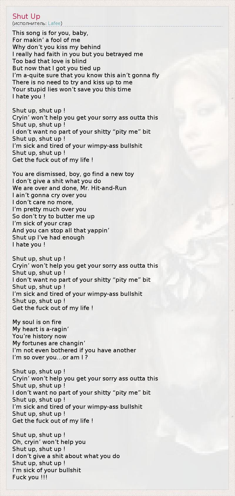 Эта песня посвещается тебе, детка, За то, что выставляешь меня дурой. Почему ты не поцелуешь мой зад? Я реально верила в тебя, но ты предал меня. Жаль, что любовь слепа. Но теперь, когда я узнала, что ты заврался, Уверена, ты знаешь, что твои прежние уловки не пройдут: Не нужно подлизываться ко мне. Твоя глупая ложь не спасет тебя на этот раз. Я ненавижу тебя! Заткнись, заткнись! Слезы не помогут тебе спасти свою зад**цу. Заткнись, заткнись! Я не хочу слышать твоё малодушное "Пожалей меня"... Заткнись, заткнись! Я жутко устала от твоего тупого вранья! Заткнись, заткнись! Убирайся из моей жизни! Ты уволен, мальчик, иди ищи новую игрушку. И мне плевать, что ты сделаешь. Между нами всё кончено, мистер Волокита, Я не собираюсь рыдать по тебе. Я больше ничего к тебе не чувствую, Я давно забыла тебя, Так что перестань меня умасливать. Меня тошнит от того, что ты несёшь, Хватит уже тявкать! Заткнись, с меня достаточно. Я ненавижу тебя! Заткнись, заткнись! Слезы не помогут тебе спасти свою зад**цу. Заткнись, заткнись! Я не хочу слышать твоё малодушное "Пожалей меня"... Заткнись, заткнись! Я жутко устала от твоего тупого вранья! Заткнись, заткнись! Убирайся из моей жизни! Моя душа испепелена, Мое сердце негодует, Ты уже - прошлое, Моя судьба теперь будет иной. И мне фиолетово, заведёшь ли ты другую или нет... Я давно забыла тебя... или я? Заткнись, заткнись! Слезы не помогут тебе спасти свою зад**цу. Заткнись, заткнись! Я не хочу слышать твоё малодушное "Пожалей меня"... Заткнись, заткнись! Я жутко устала от твоего тупого вранья! Заткнись, заткнись! Убирайся из моей жизни! Заткнись, заткнись! О, слезы не помогут тебе Заткнись, заткнись! И мне плевать, что ты сделаешь. Заткнись, заткнись! Я сыта по горло твоим враньём! Пошел ты!!!