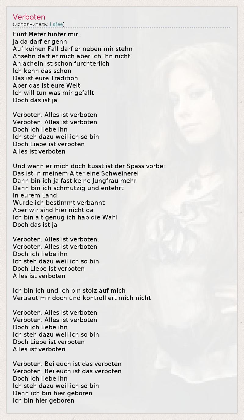 Funf Meter hinter mir. Ja da darf er gehn Auf keinen Fall darf er neben mir stehn Ansehn darf er mich aber ich ihn nicht Anlacheln ist schon furchterlich Ich kenn das schon Das ist eure Tradition Aber das ist eure Welt Ich will tun was mir gefallt Doch das ist ja Verboten. Alles ist verboten Verboten. Alles ist verboten Doch ich liebe ihn Ich steh dazu weil ich so bin Doch Liebe ist verboten Alles ist verboten Und wenn er mich doch kusst ist der Spass vorbei Das ist in meinem Alter eine Schweinerei Dann bin ich ja fast keine Jungfrau mehr Dann bin ich schmutzig und entehrt In eurem Land Wurde ich bestimmt verbannt Aber wir sind hier nicht da Ich bin alt genug ich hab die Wahl Doch das ist ja Verboten. Alles ist verboten. Verboten. Alles ist verboten Doch ich liebe ihn Ich steh dazu weil ich so bin Doch Liebe ist verboten Alles ist verboten Ich bin ich und ich bin stolz auf mich Vertraut mir doch und kontrolliert mich nicht Verboten. Alles ist verboten Verboten. Alles ist verboten Doch ich liebe ihn Ich steh dazu weil ich so bin Doch Liebe ist verboten Alles ist verboten Verboten. Bei euch ist das verboten Verboten. Bei euch ist das verboten Doch ich liebe ihn Ich steh dazu weil ich so bin Denn ich bin hier geboren Ich bin hier geboren