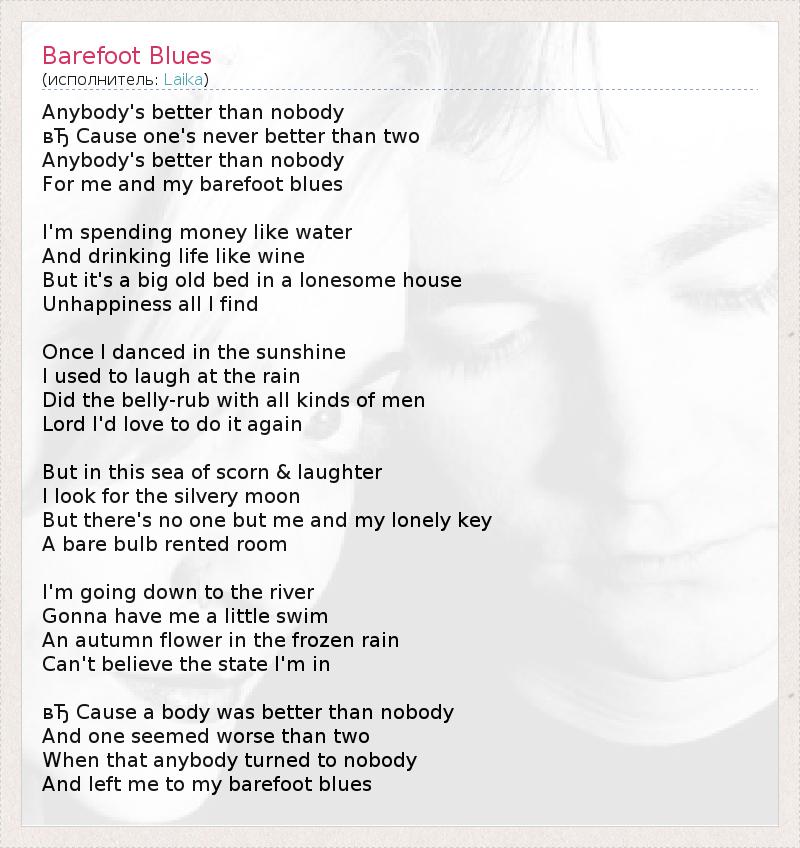Anybody's better than nobody †Cause one's never better than two Anybody's better than nobody For me and my barefoot blues I'm spending money like water And drinking life like wine But it's a big old bed in a lonesome house Unhappiness all I find Once I danced in the sunshine I used to laugh at the rain Did the belly-rub with all kinds of men Lord I'd love to do it again But in this sea of scorn & laughter I look for the silvery moon But there's no one but me and my lonely key A bare bulb rented room I'm going down to the river Gonna have me a little swim An autumn flower in the frozen rain Can't believe the state I'm in †Cause a body was better than nobody And one seemed worse than two When that anybody turned to nobody And left me to my barefoot blues