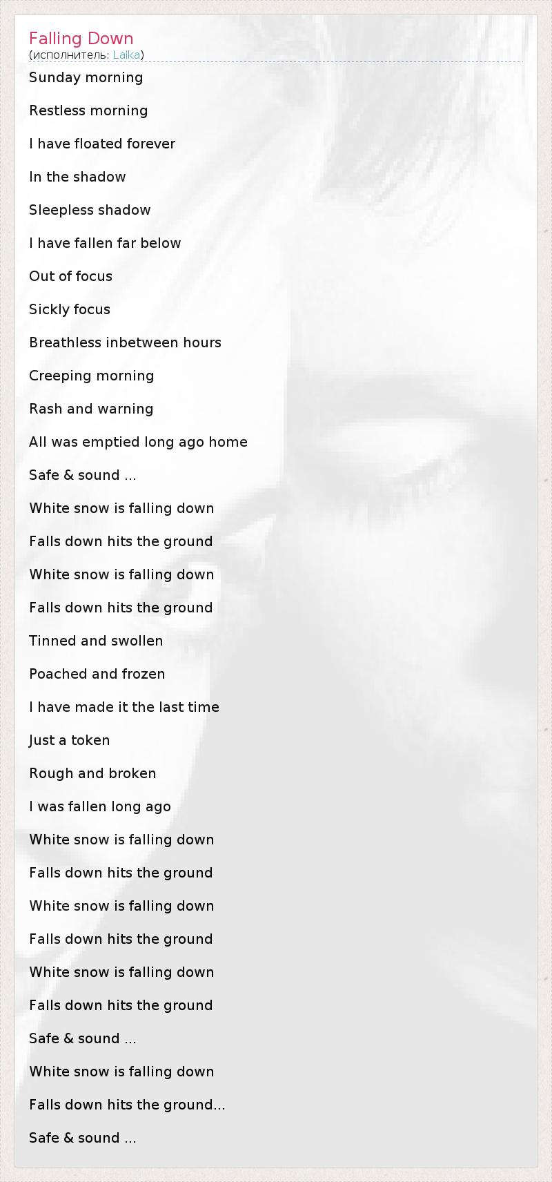 Sunday morning Restless morning I have floated forever In the shadow Sleepless shadow I have fallen far below Out of focus Sickly focus Breathless inbetween hours Creeping morning Rash and warning All was emptied long ago home Safe & sound ... White snow is falling down Falls down hits the ground White snow is falling down Falls down hits the ground Tinned and swollen Poached and frozen I have made it the last time Just a token Rough and broken I was fallen long ago White snow is falling down Falls down hits the ground White snow is falling down Falls down hits the ground White snow is falling down Falls down hits the ground Safe & sound ... White snow is falling down Falls down hits the ground... Safe & sound ...