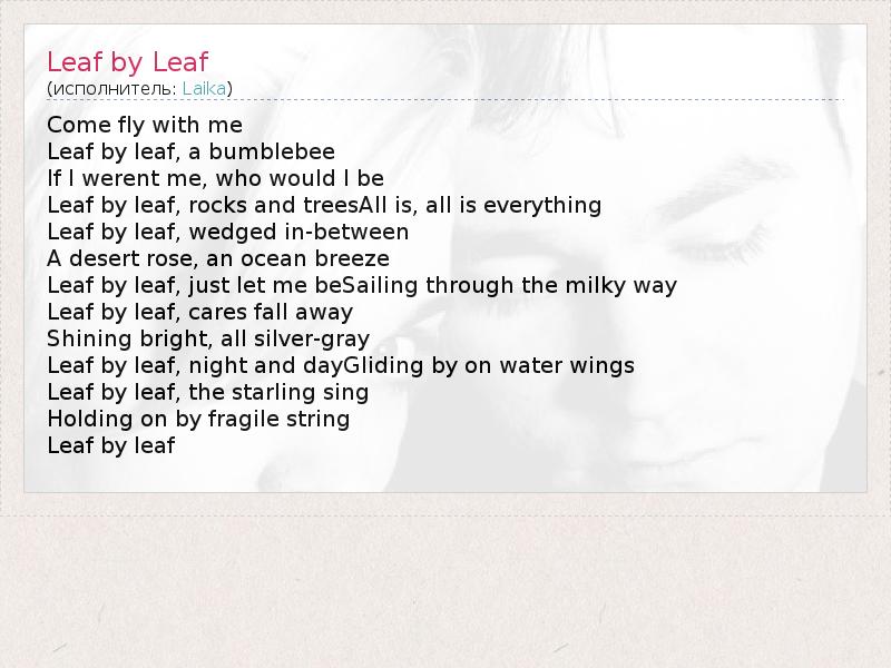 Come fly with me Leaf by leaf, a bumblebee If I werent me, who would I be Leaf by leaf, rocks and treesAll is, all is everything Leaf by leaf, wedged in-between A desert rose, an ocean breeze Leaf by leaf, just let me beSailing through the milky way Leaf by leaf, cares fall away Shining bright, all silver-gray Leaf by leaf, night and dayGliding by on water wings Leaf by leaf, the starling sing Holding on by fragile string Leaf by leaf
