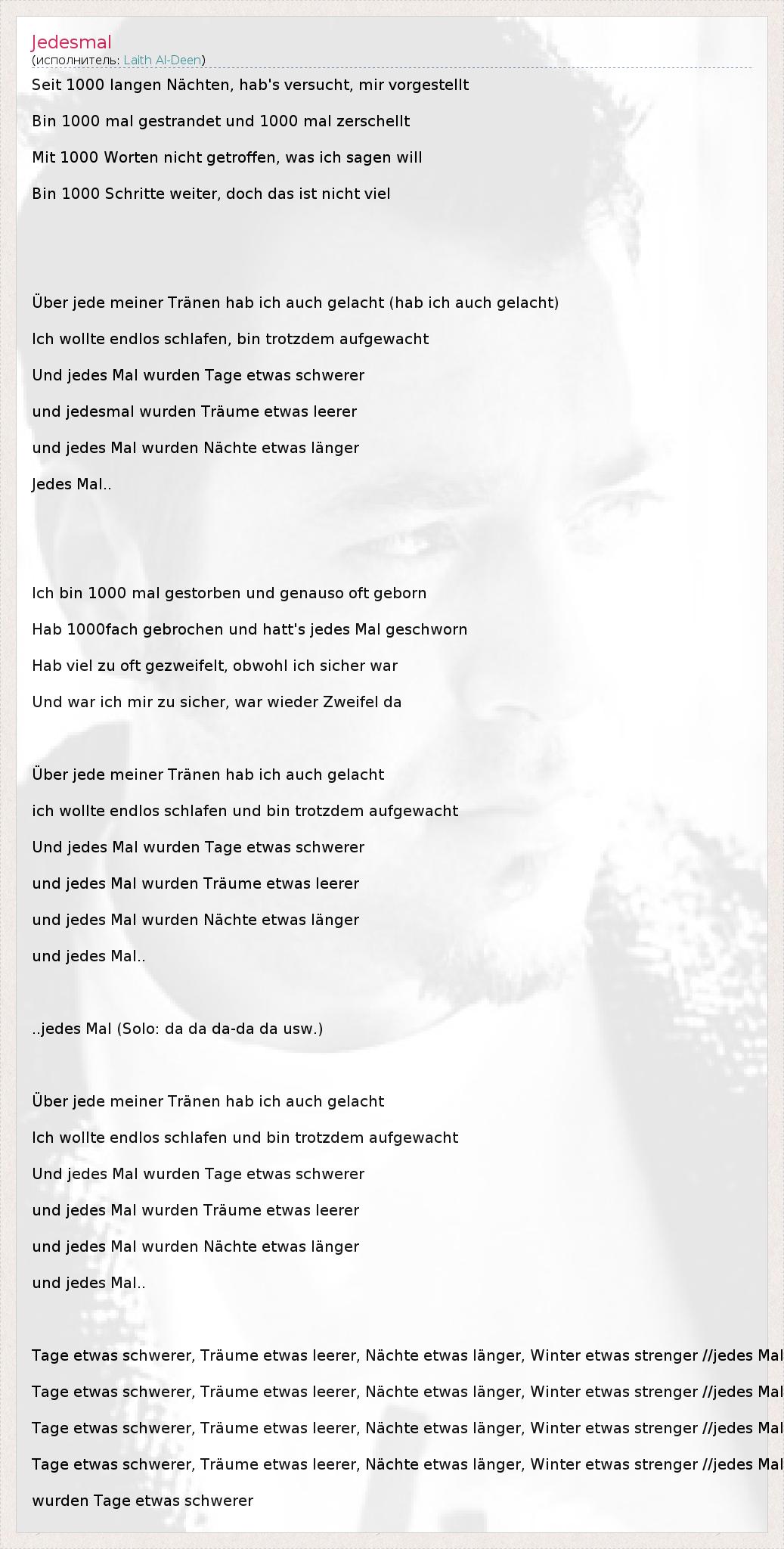 Seit 1000 langen Nächten, hab's versucht, mir vorgestellt Bin 1000 mal gestrandet und 1000 mal zerschellt Mit 1000 Worten nicht getroffen, was ich sagen will Bin 1000 Schritte weiter, doch das ist nicht viel Über jede meiner Tränen hab ich auch gelacht (hab ich auch gelacht) Ich wollte endlos schlafen, bin trotzdem aufgewacht Und jedes Mal wurden Tage etwas schwerer und jedesmal wurden Träume etwas leerer und jedes Mal wurden Nächte etwas länger Jedes Mal.. Ich bin 1000 mal gestorben und genauso oft geborn Hab 1000fach gebrochen und hatt's jedes Mal geschworn Hab viel zu oft gezweifelt, obwohl ich sicher war Und war ich mir zu sicher, war wieder Zweifel da Über jede meiner Tränen hab ich auch gelacht ich wollte endlos schlafen und bin trotzdem aufgewacht Und jedes Mal wurden Tage etwas schwerer und jedes Mal wurden Träume etwas leerer und jedes Mal wurden Nächte etwas länger und jedes Mal.. ..jedes Mal (Solo: da da da-da da usw.) Über jede meiner Tränen hab ich auch gelacht Ich wollte endlos schlafen und bin trotzdem aufgewacht Und jedes Mal wurden Tage etwas schwerer und jedes Mal wurden Träume etwas leerer und jedes Mal wurden Nächte etwas länger und jedes Mal.. Tage etwas schwerer, Träume etwas leerer, Nächte etwas länger, Winter etwas strenger //jedes Mal Tage etwas schwerer, Träume etwas leerer, Nächte etwas länger, Winter etwas strenger //jedes Mal Tage etwas schwerer, Träume etwas leerer, Nächte etwas länger, Winter etwas strenger //jedes Mal Tage etwas schwerer, Träume etwas leerer, Nächte etwas länger, Winter etwas strenger //jedes Mal wurden Tage etwas schwerer